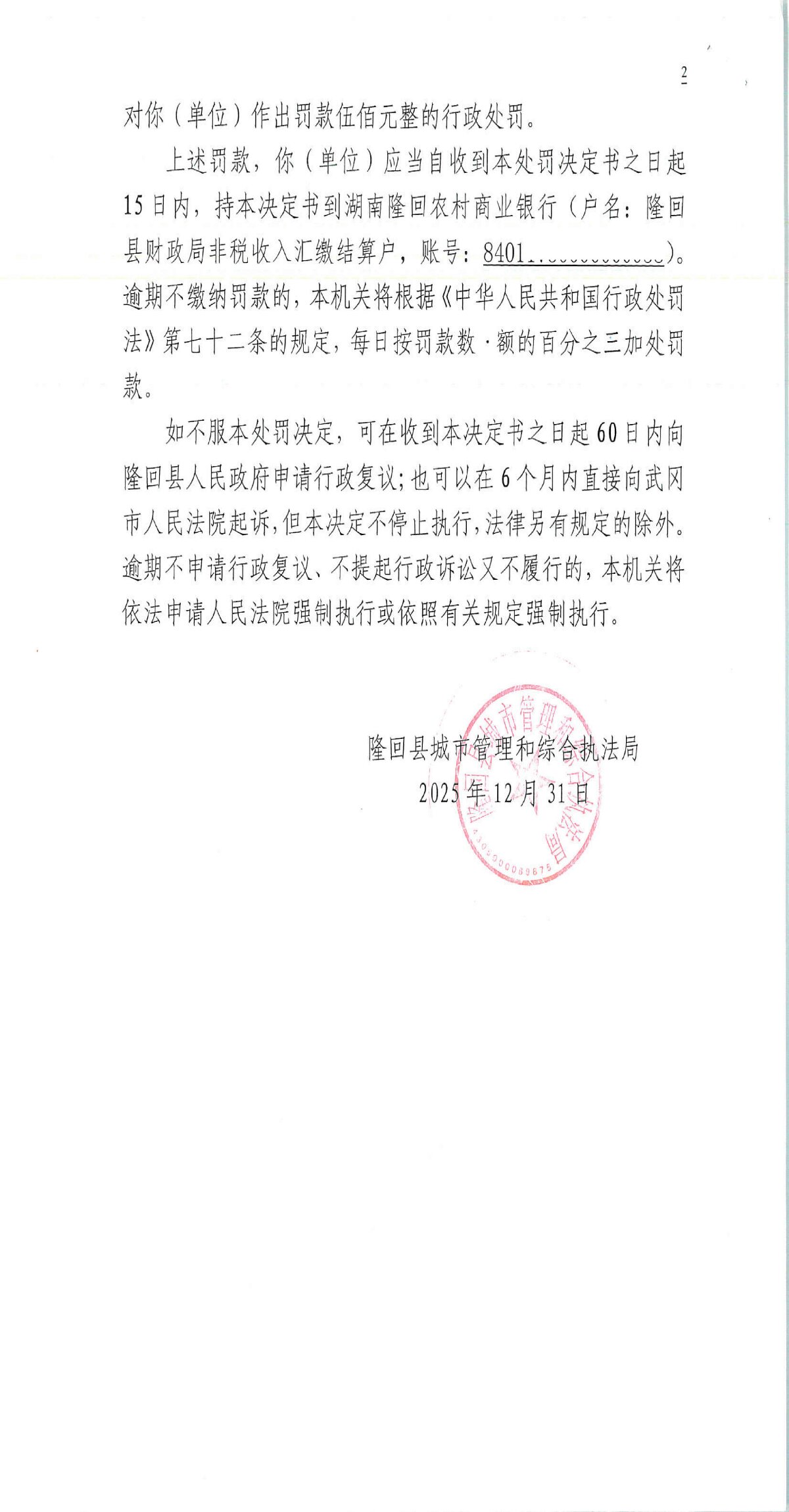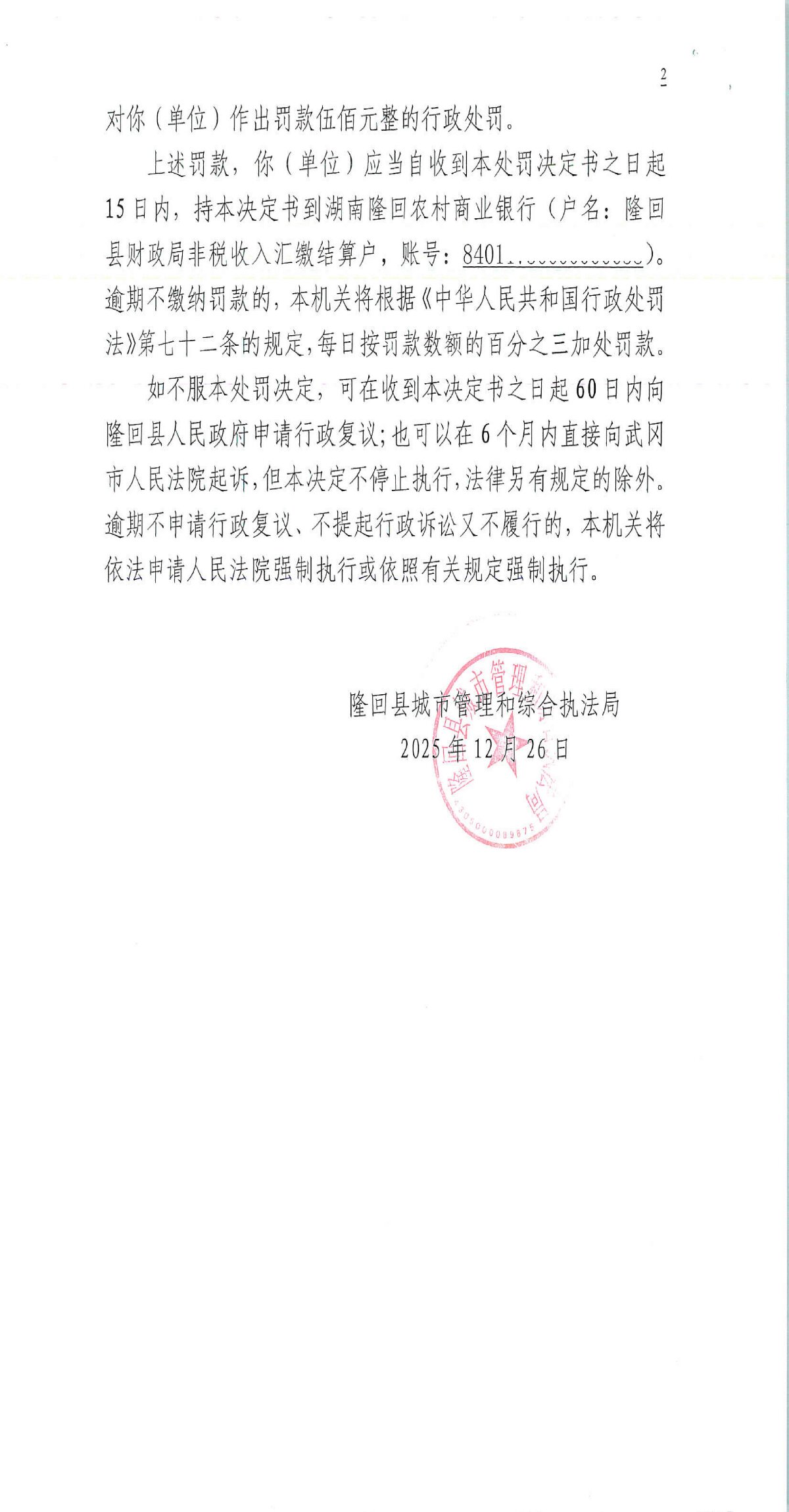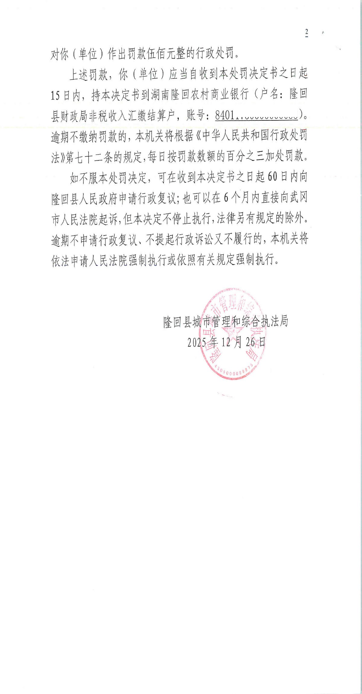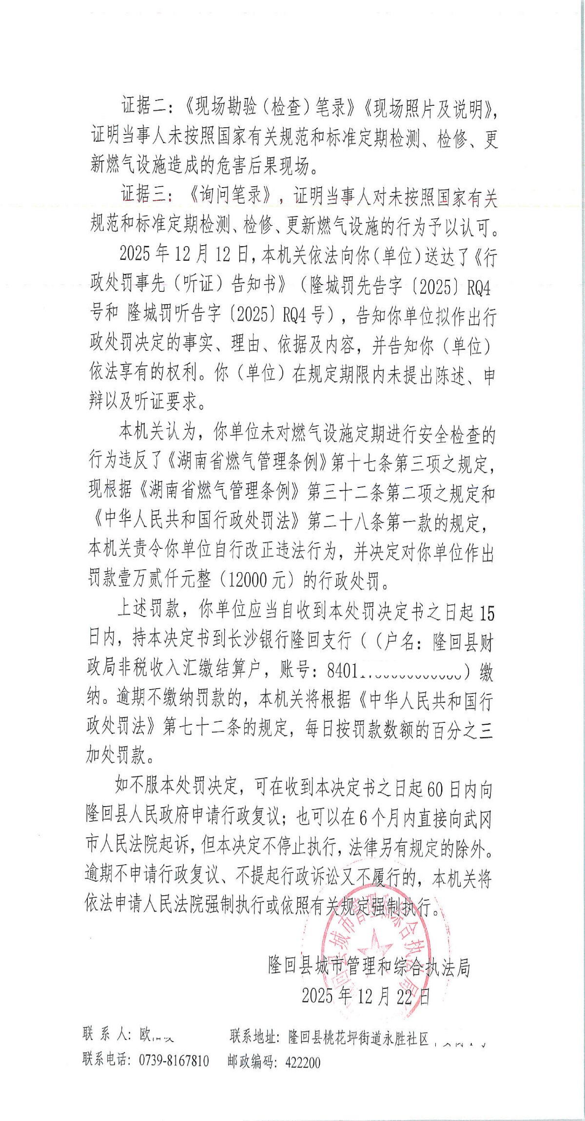 隆回县城市管理和综合执法局2025年12月份行政处罚决定书