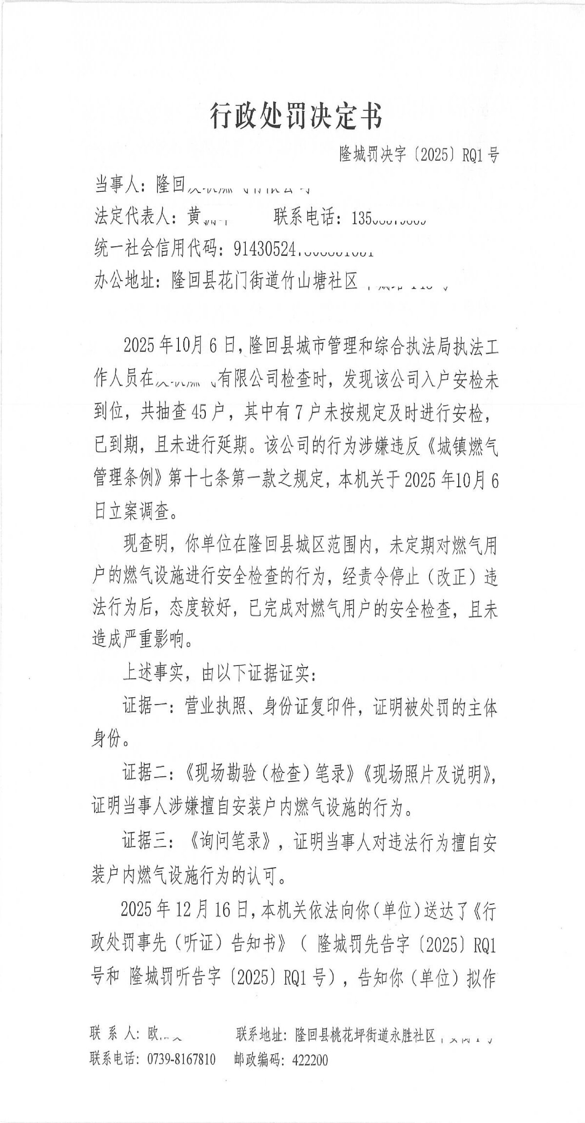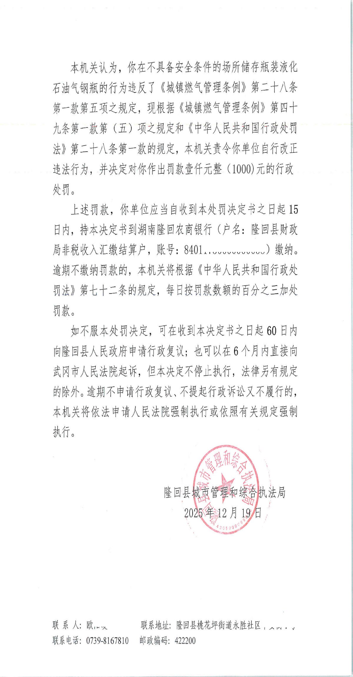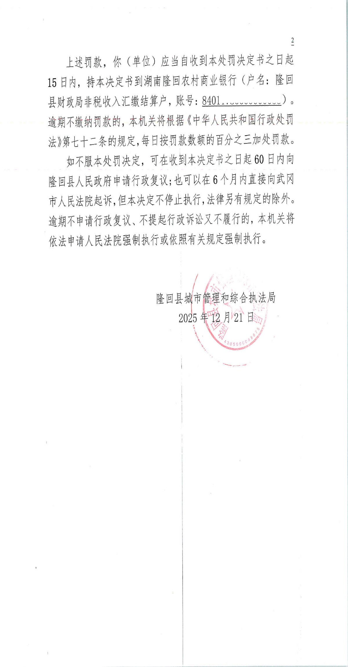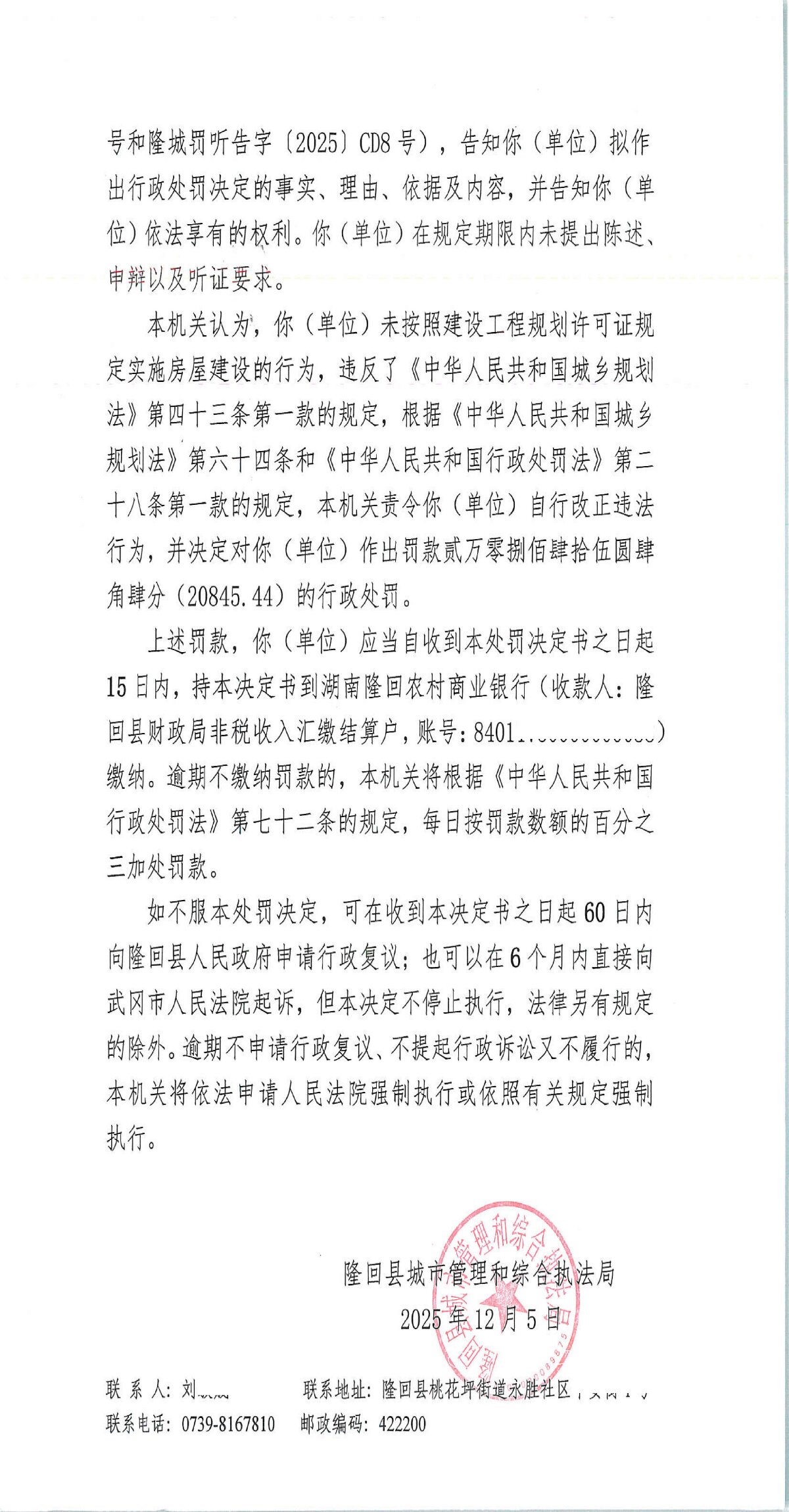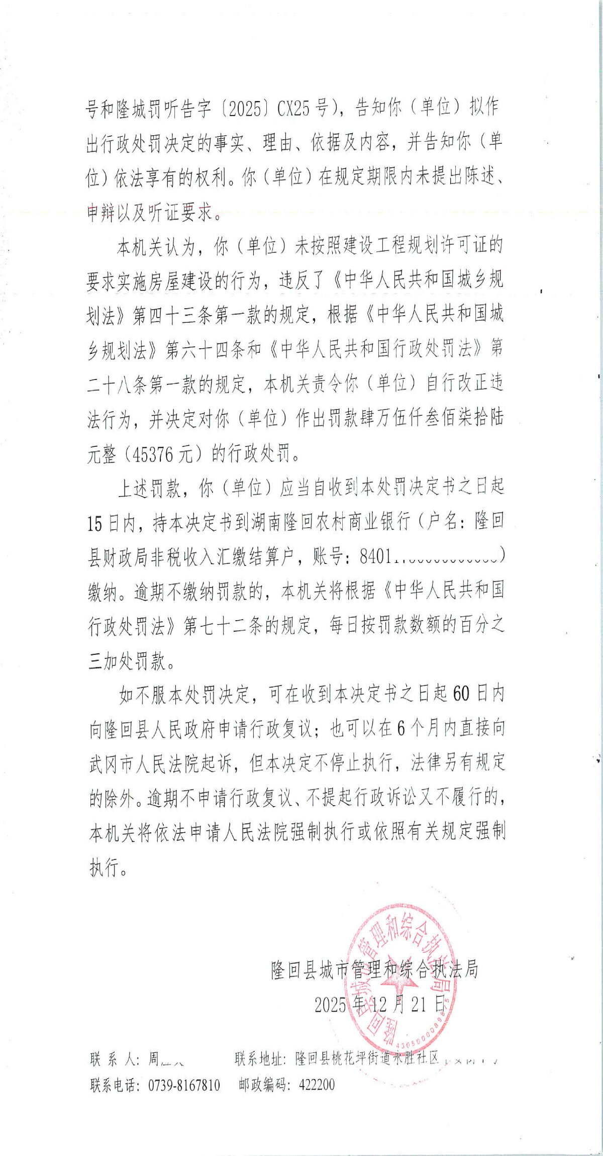 隆回县城市管理和综合执法局2025年12月份行政处罚决定书
