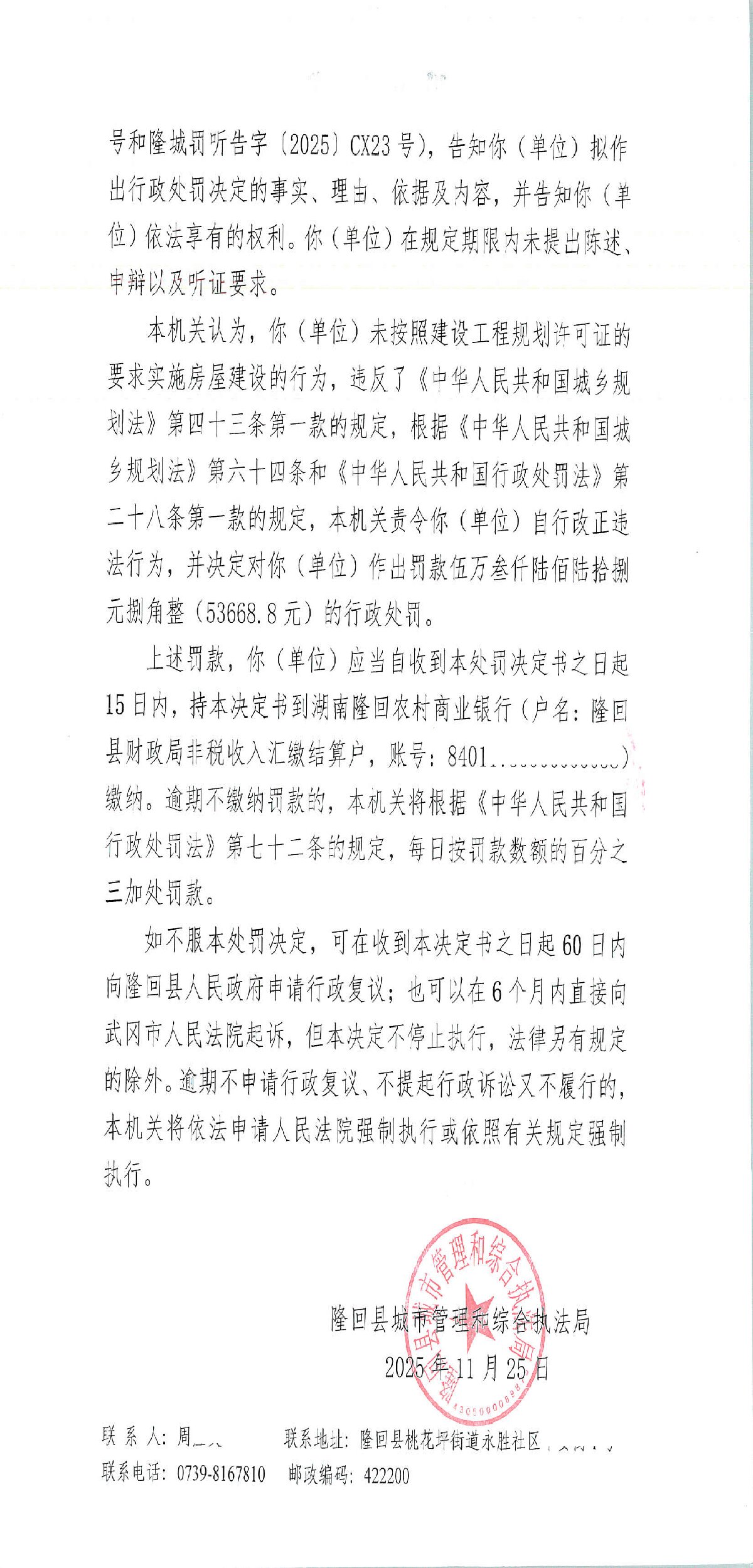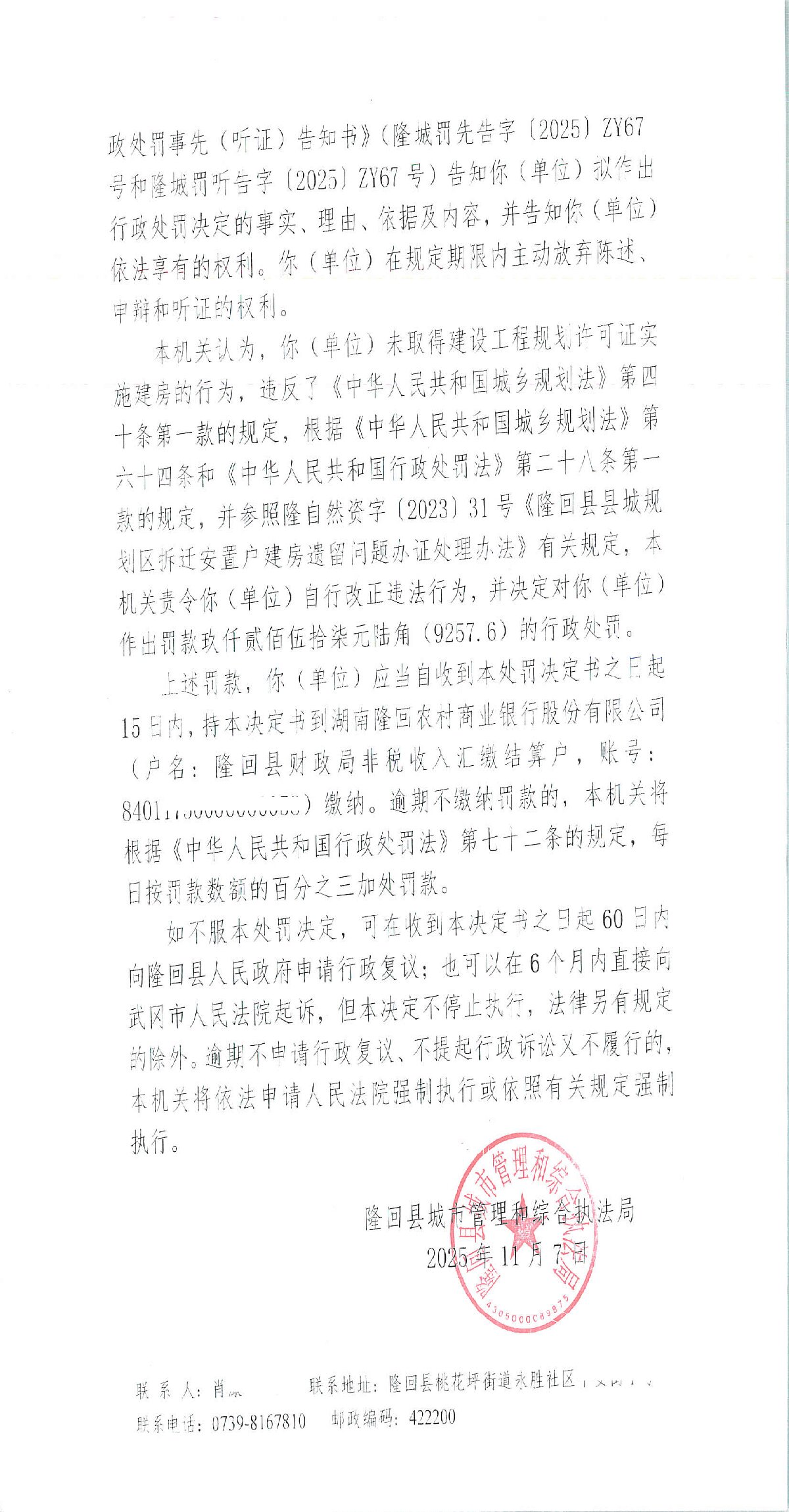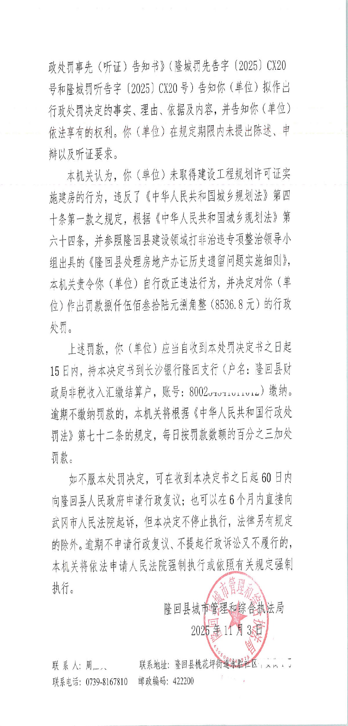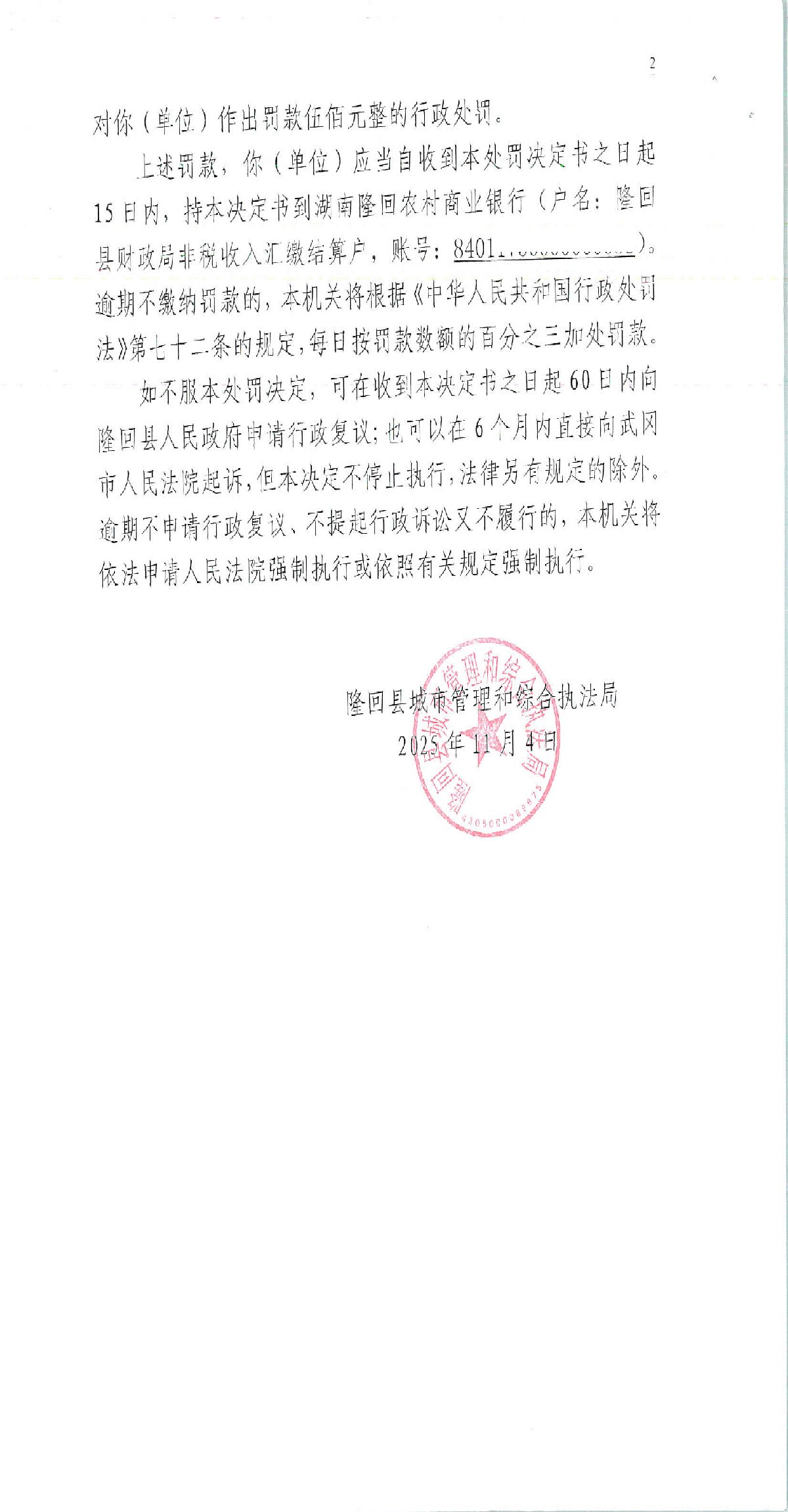 隆回县城市管理和综合执法局2025年11月份行政处罚决定书