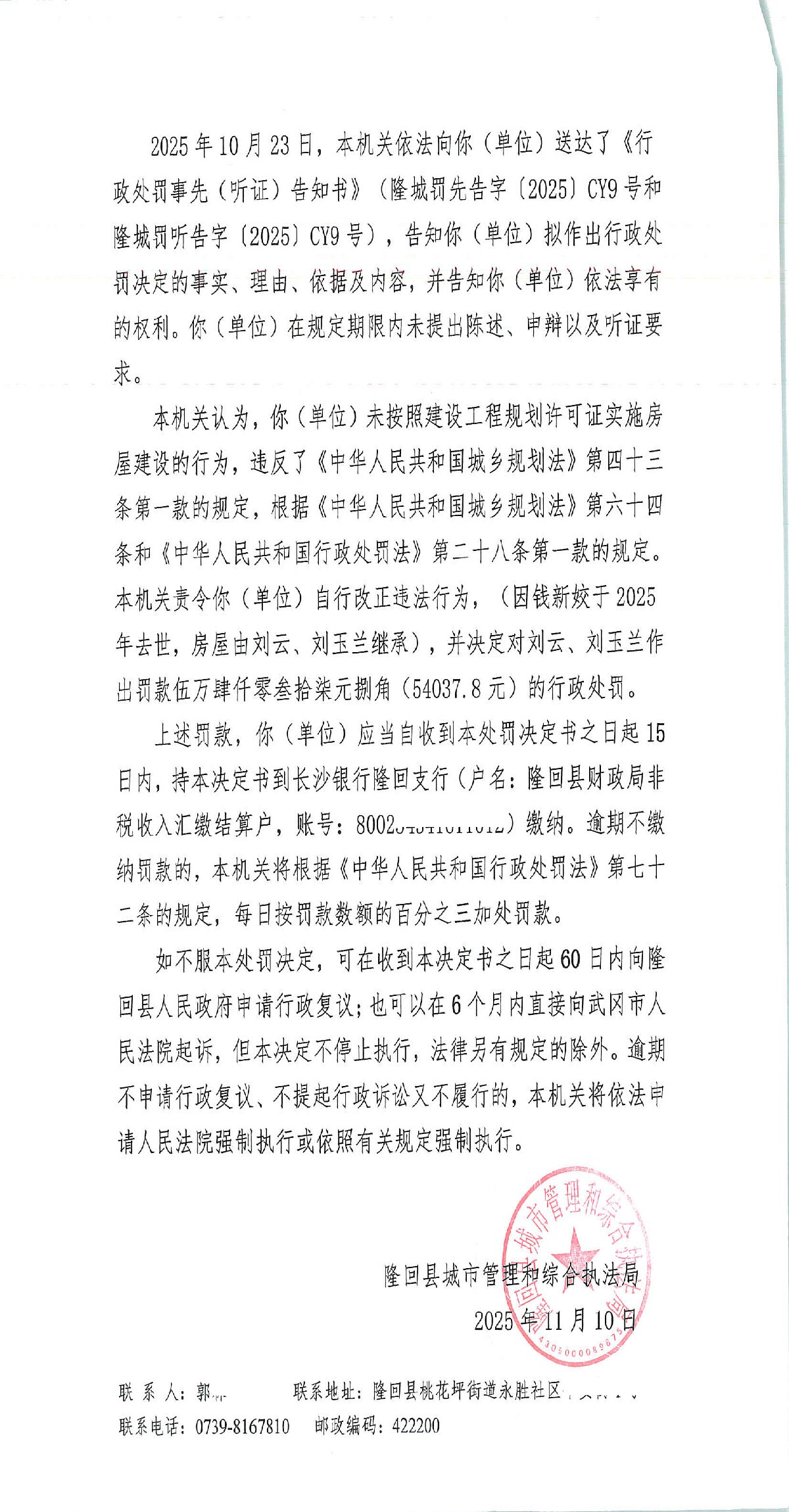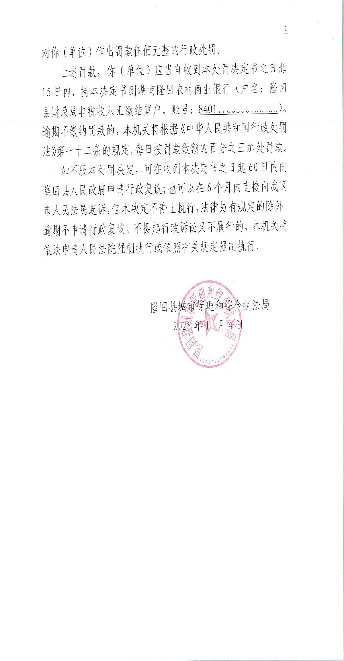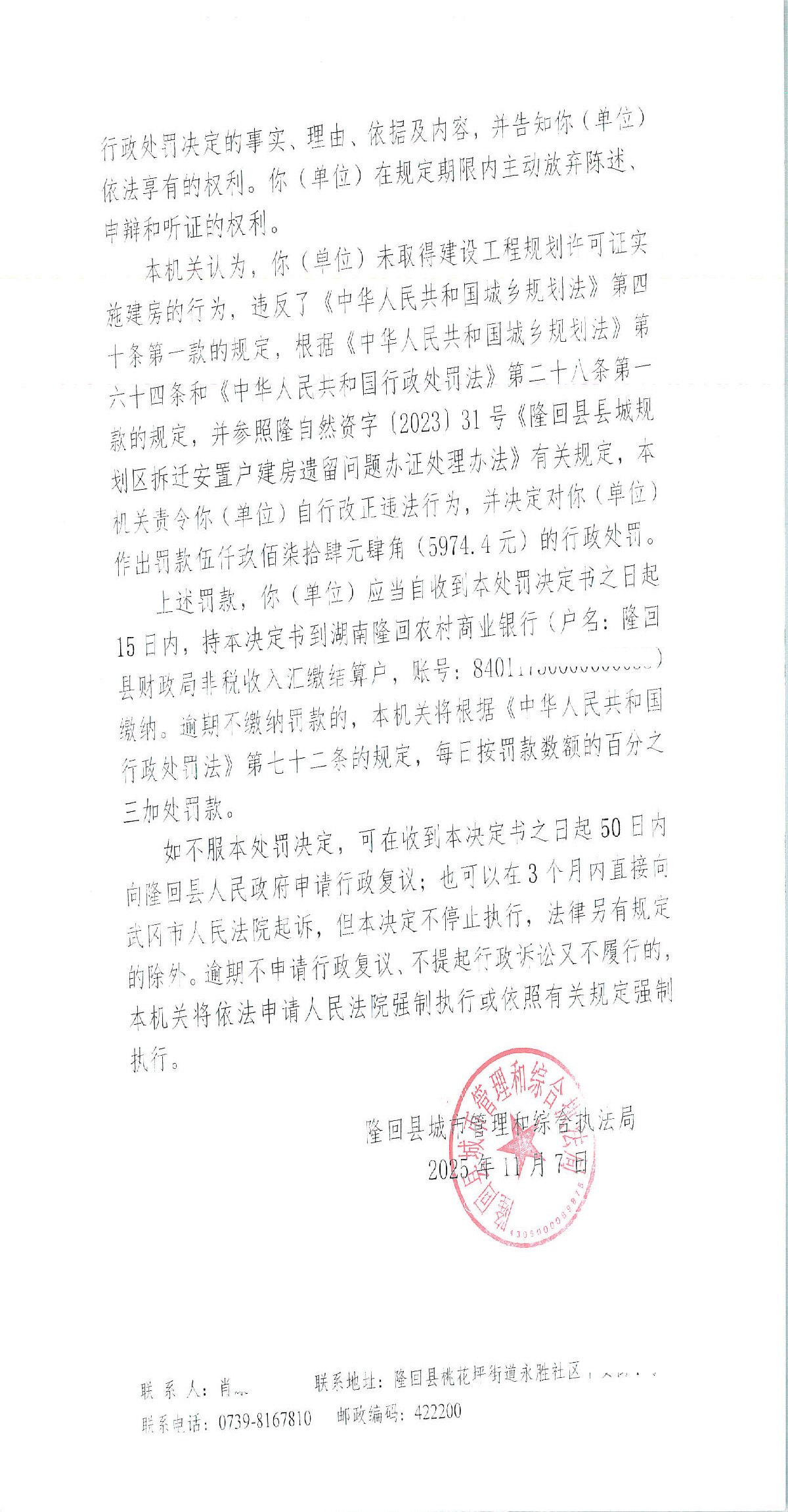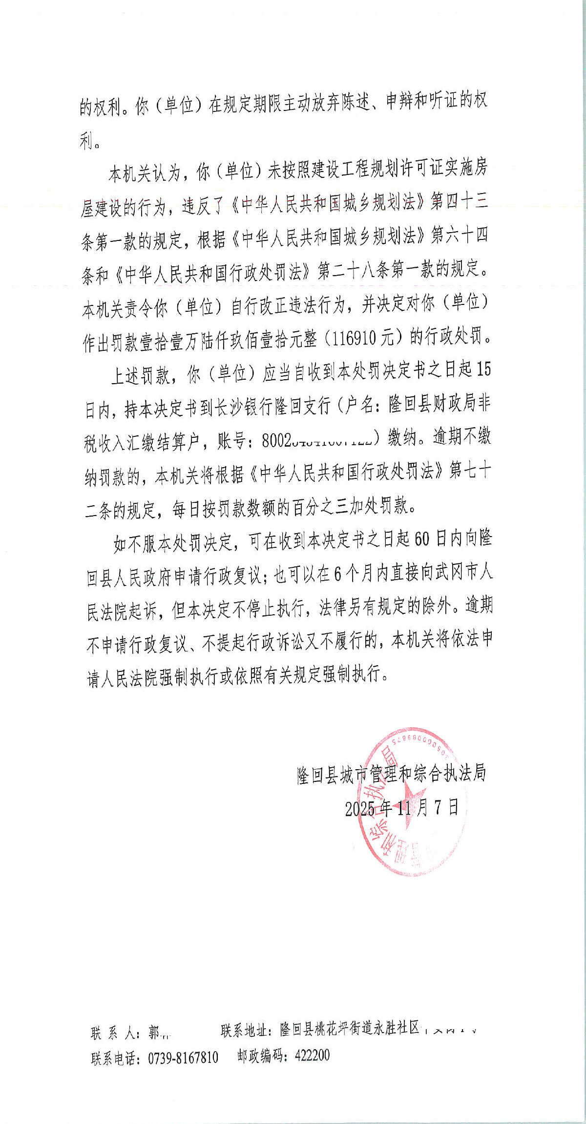 隆回县城市管理和综合执法局2025年11月份行政处罚决定书