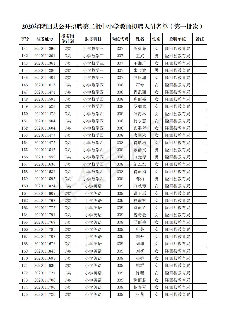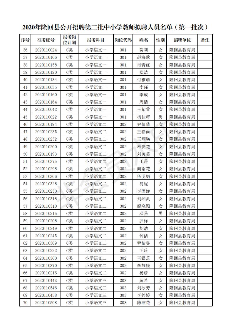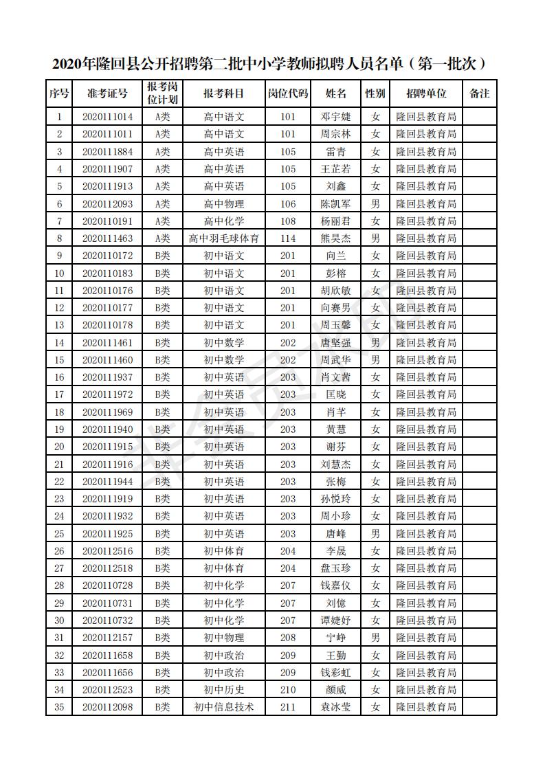 附表:2020年隆回县公开招聘第二批中小学教师拟聘人员名单(第一批次)