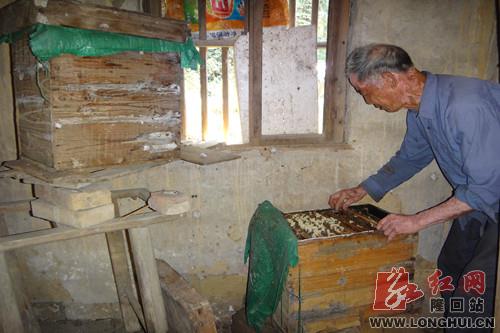 图为养蜂场主人范克民在冬暖夏凉的土坯房里观察中蜂的活动情形。
