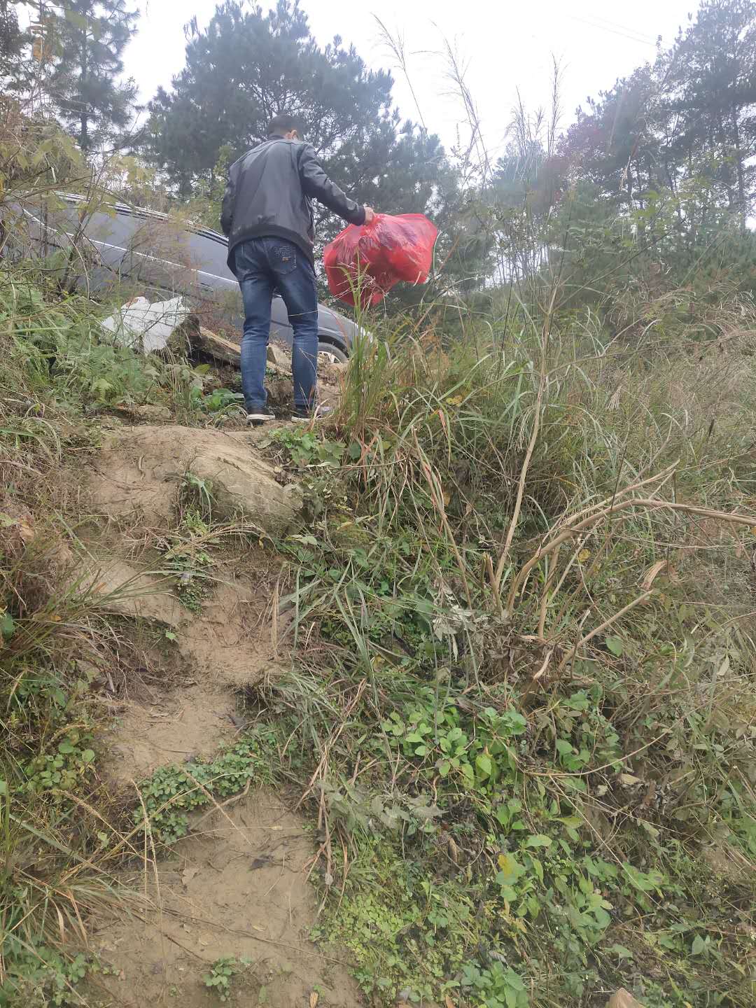 图为周旺镇镇长肖拥军将水库周边垃圾清理后打包带走