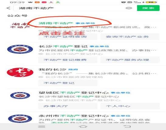 通过搜索框搜索并关注“湖南不动产”,进入“湖南不动产”微信公众号。