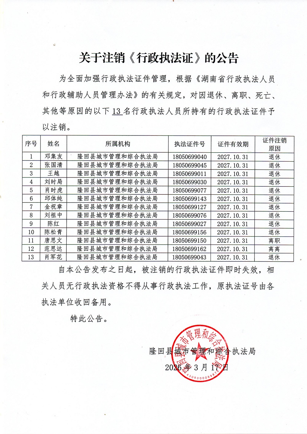 隆回县城市管理和综合执法局关于注销《行政执法证》的公告