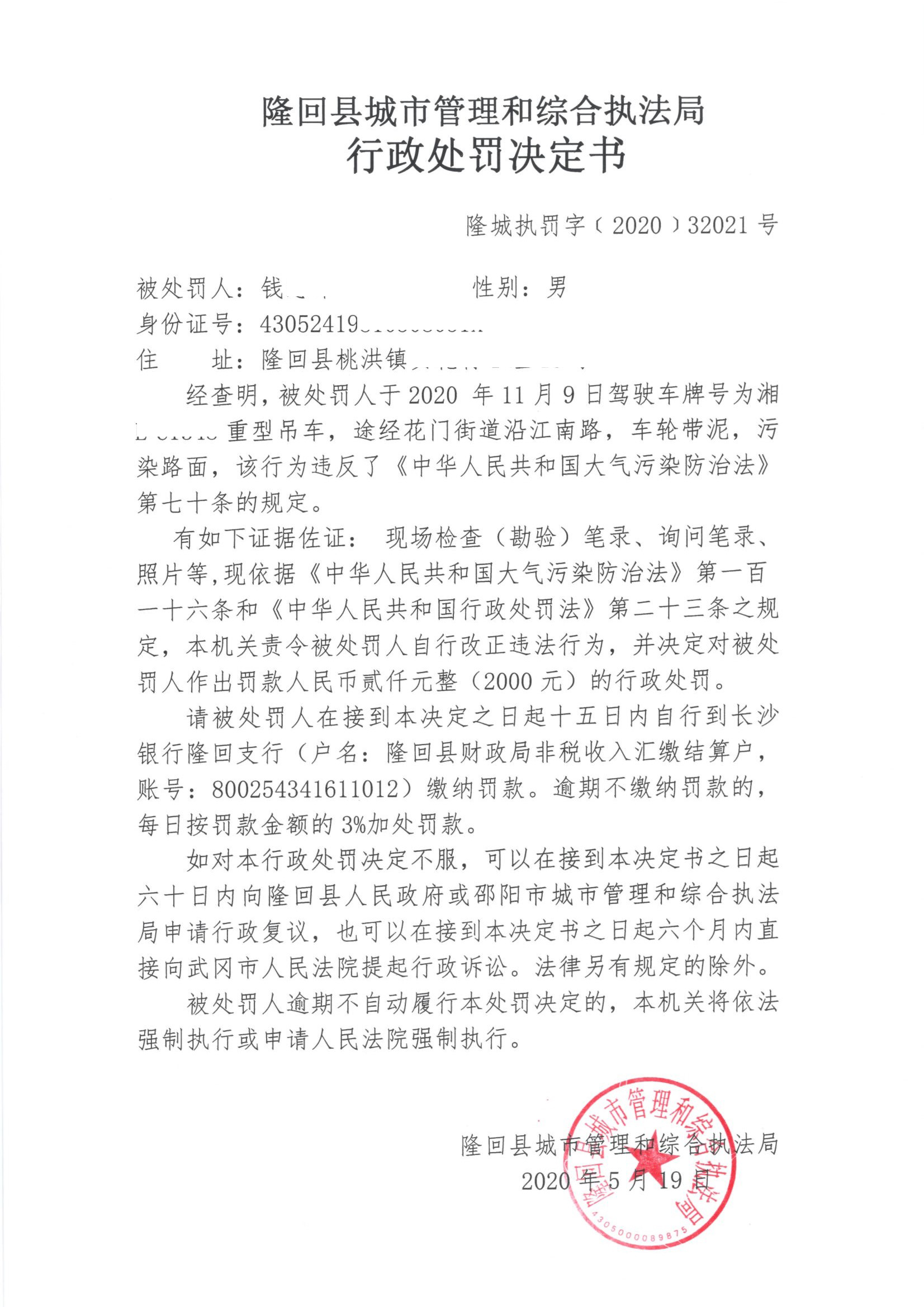 2020年隆回县城市管理和综合执法局行政处罚决定书公示(五月)