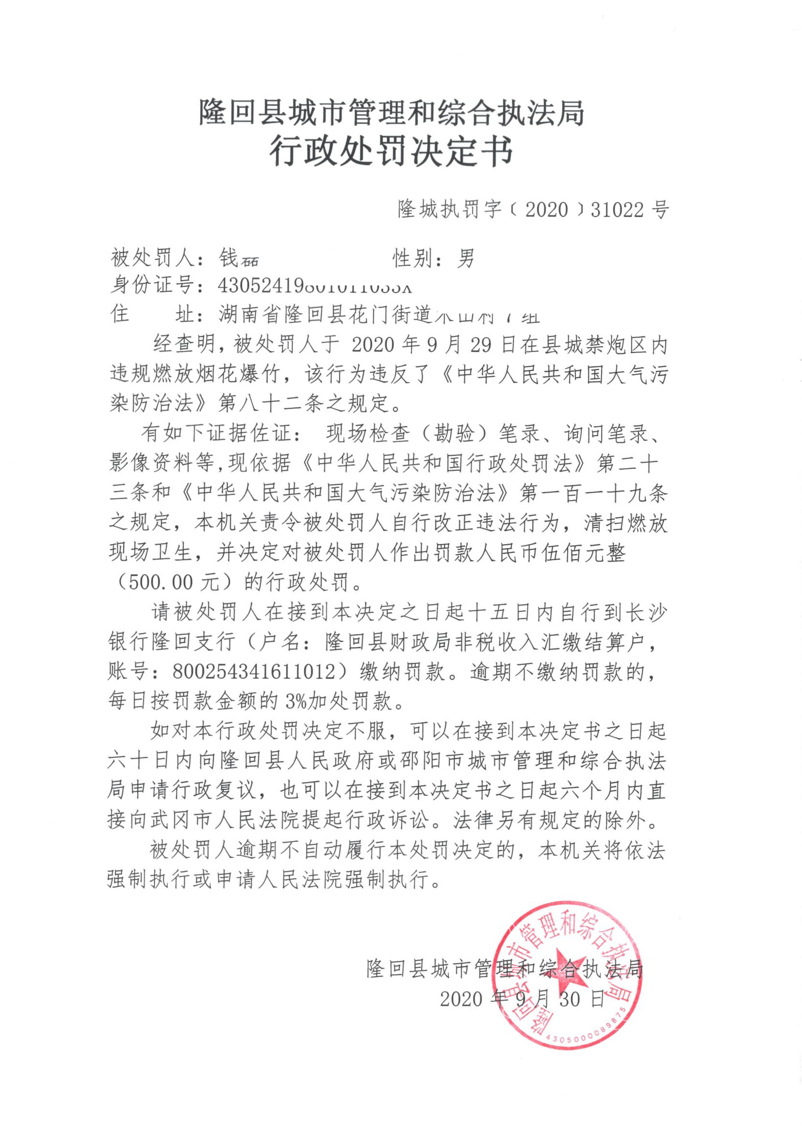 2020年隆回县城市管理和综合执法局行政处罚决定书公示(九月)