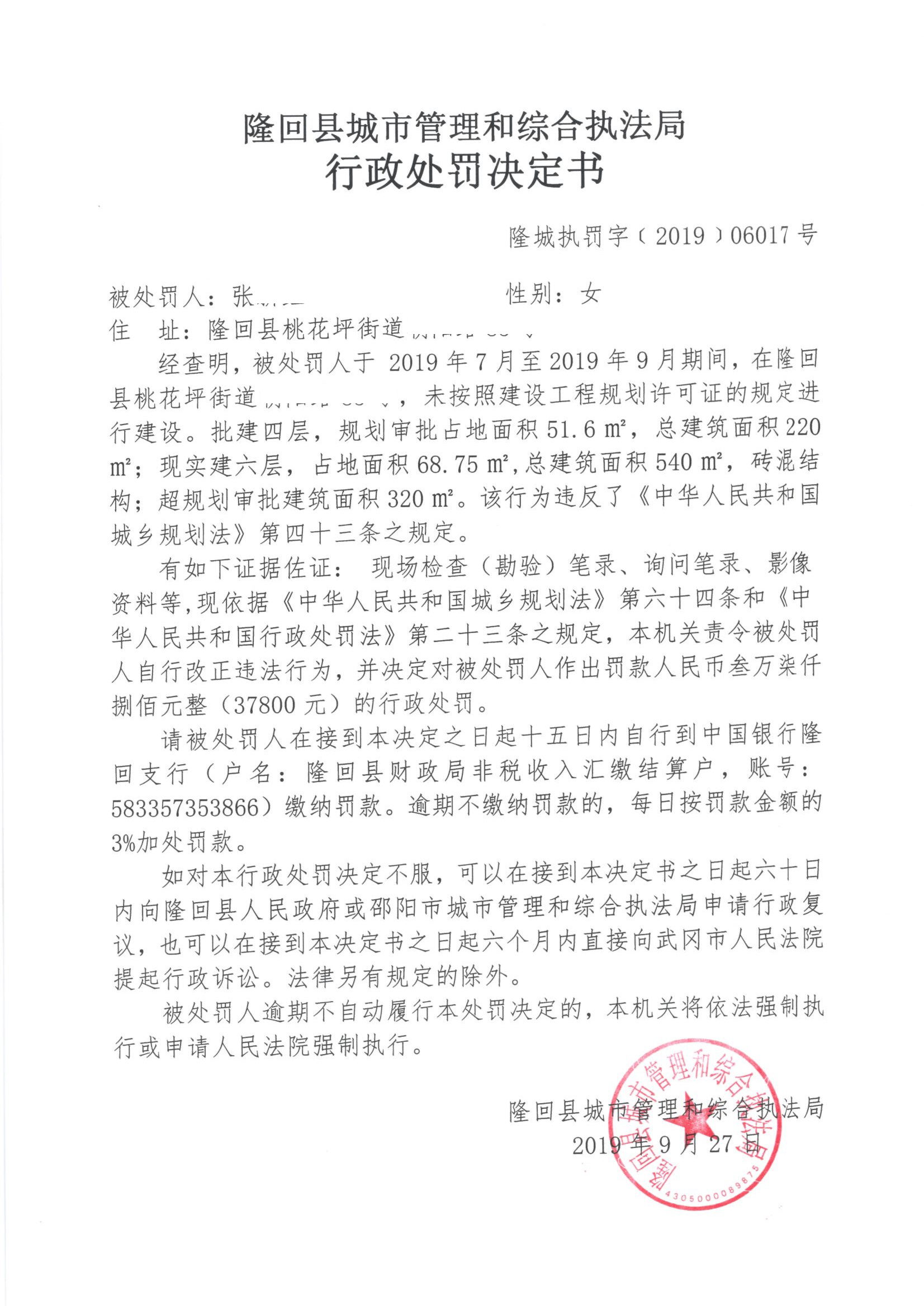2019年隆回县城市管理和综合执法局行政处罚决定书公示(九月)