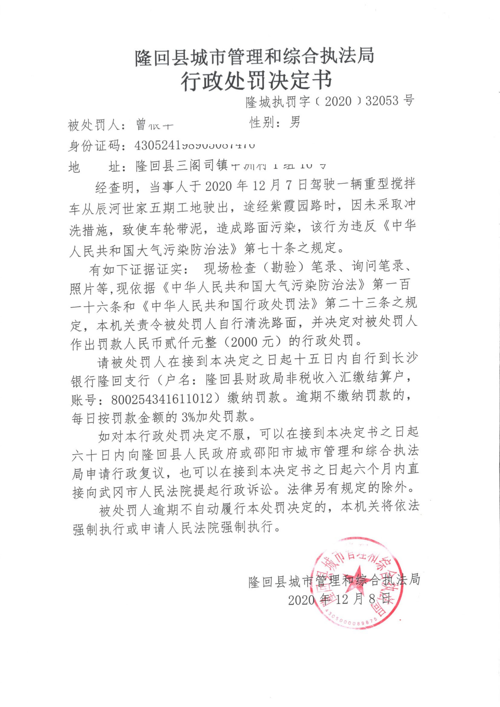 2020年隆回县城市管理和综合执法局行政处罚决定书公示(十二月)