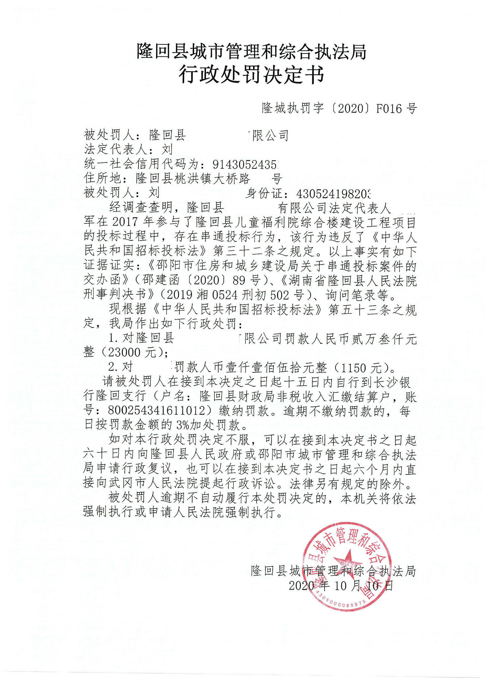 2020年隆回县城市管理和综合执法局行政处罚决定书公示(十月)