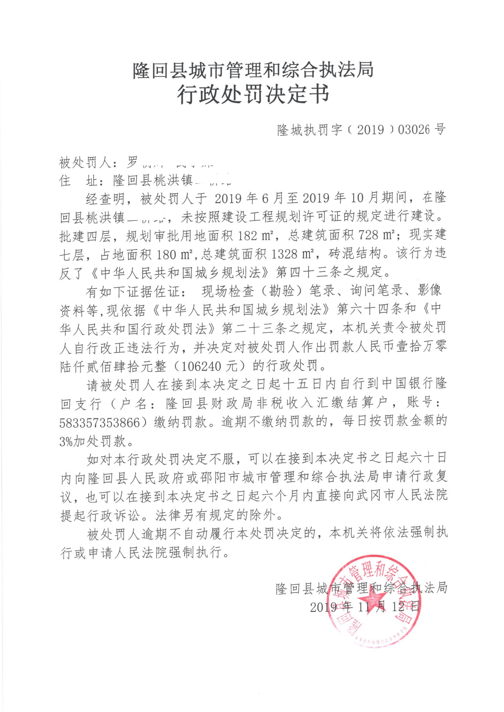 2019年隆回县城市管理和综合执法局行政处罚决定书公示(十一月)