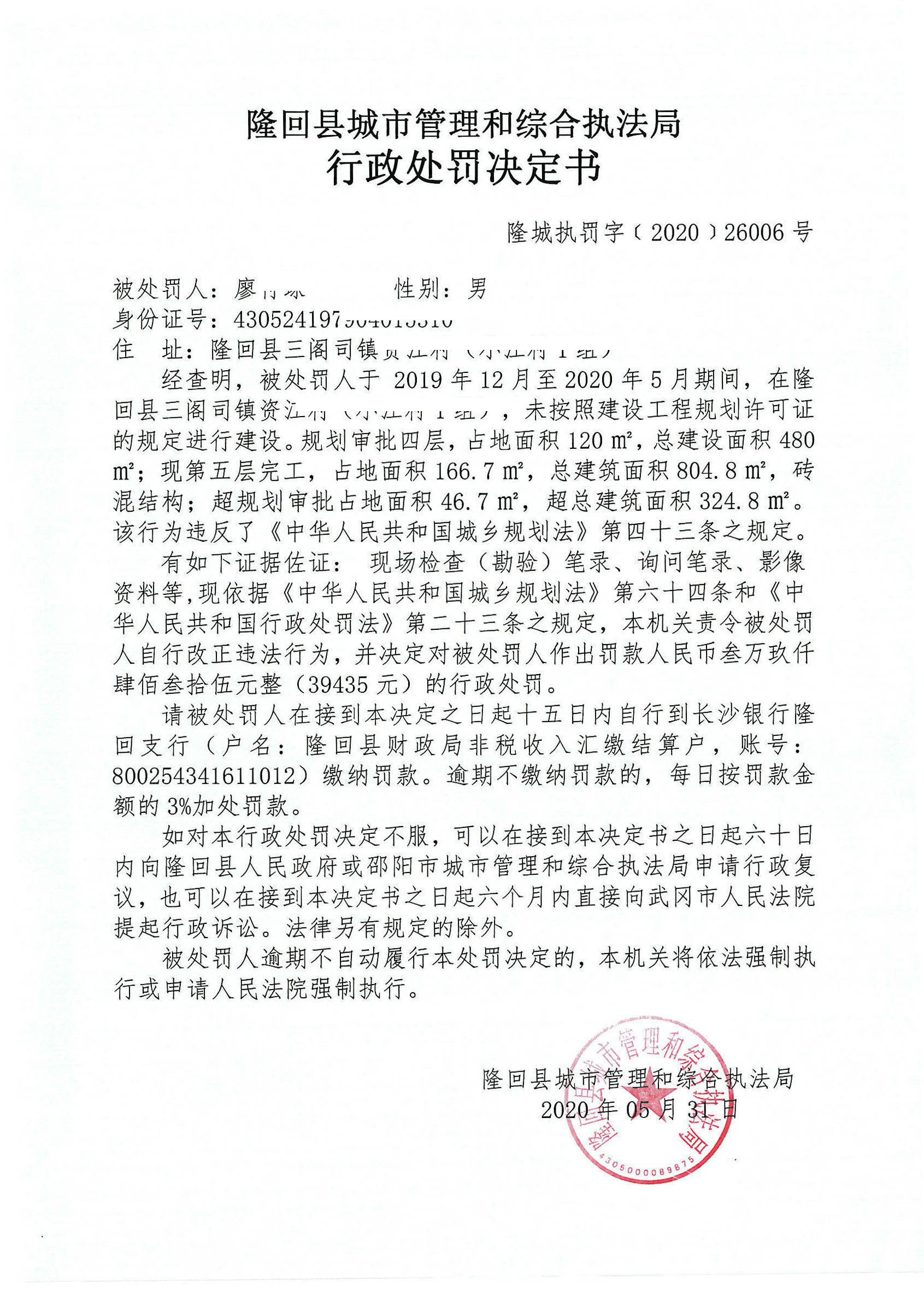2020年隆回县城市管理和综合执法局行政处罚决定书公示(五月)