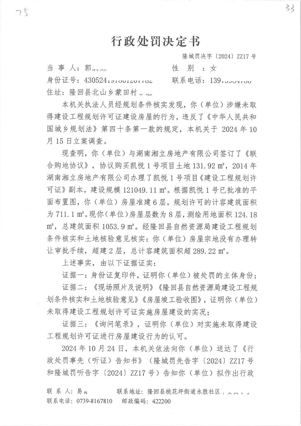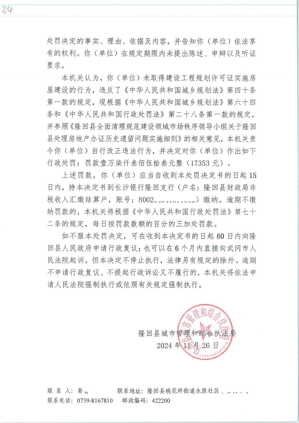 2024年隆回县城市管理和综合执法局行政处罚决定书(十一月份)