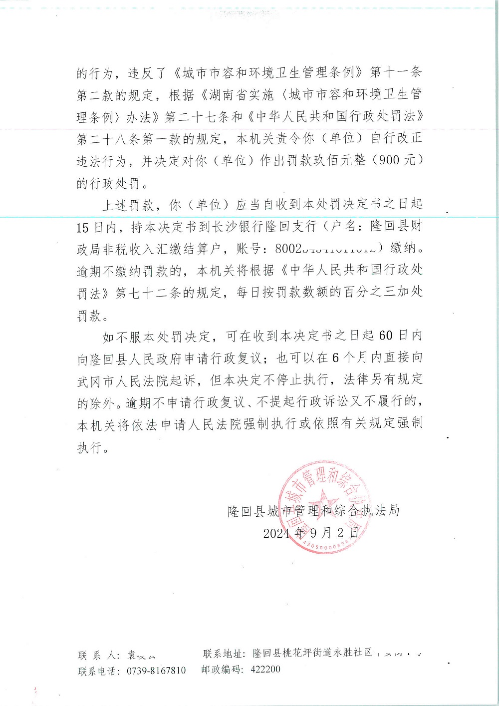2024年隆回县城市管理和综合执法局行政处罚决定书(九月份)