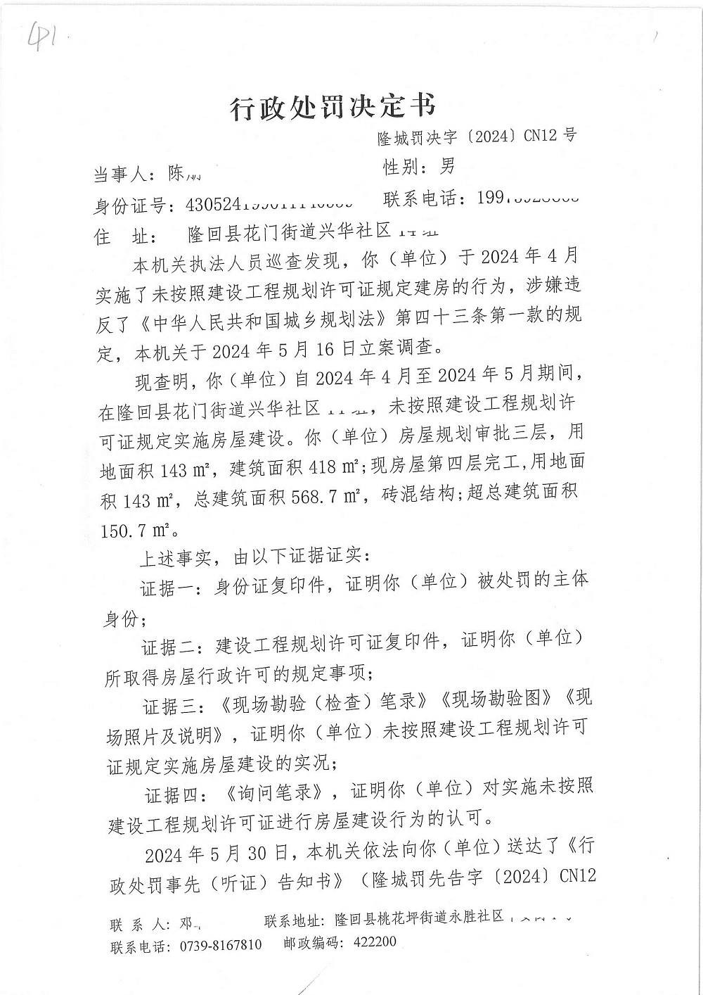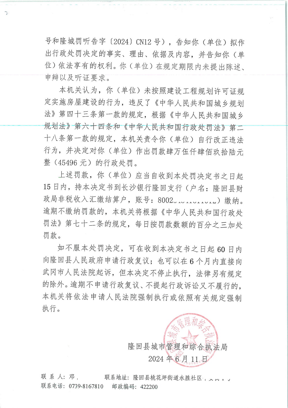2024年隆回县城市管理和综合执法局行政处罚决定书(六月份)