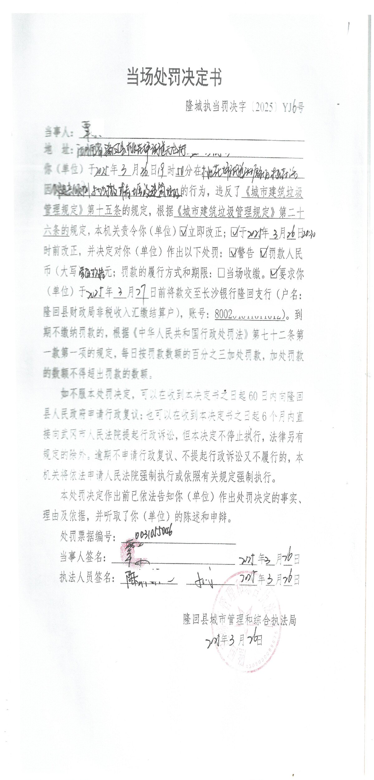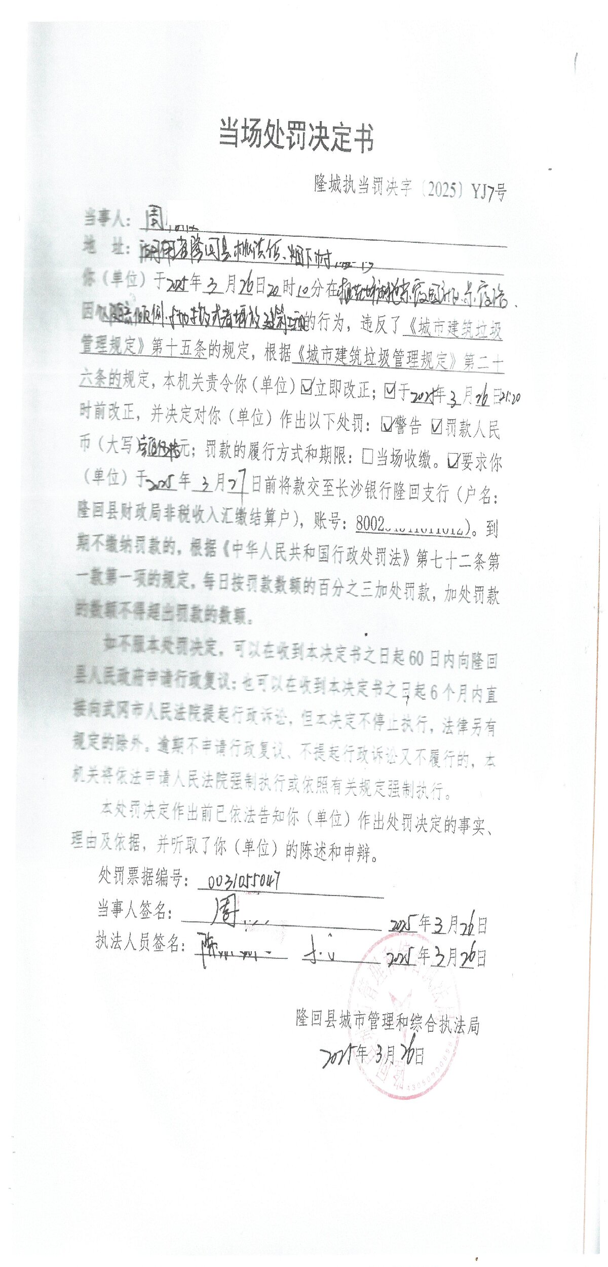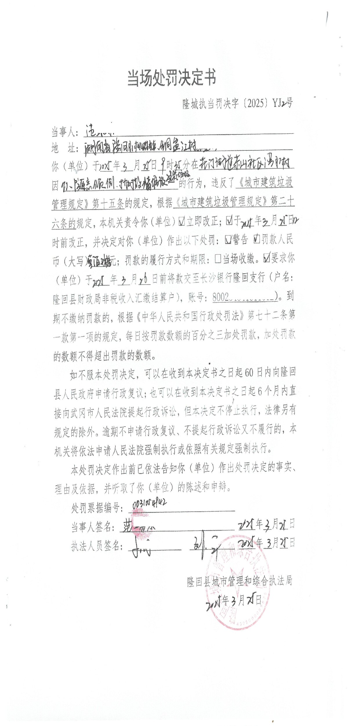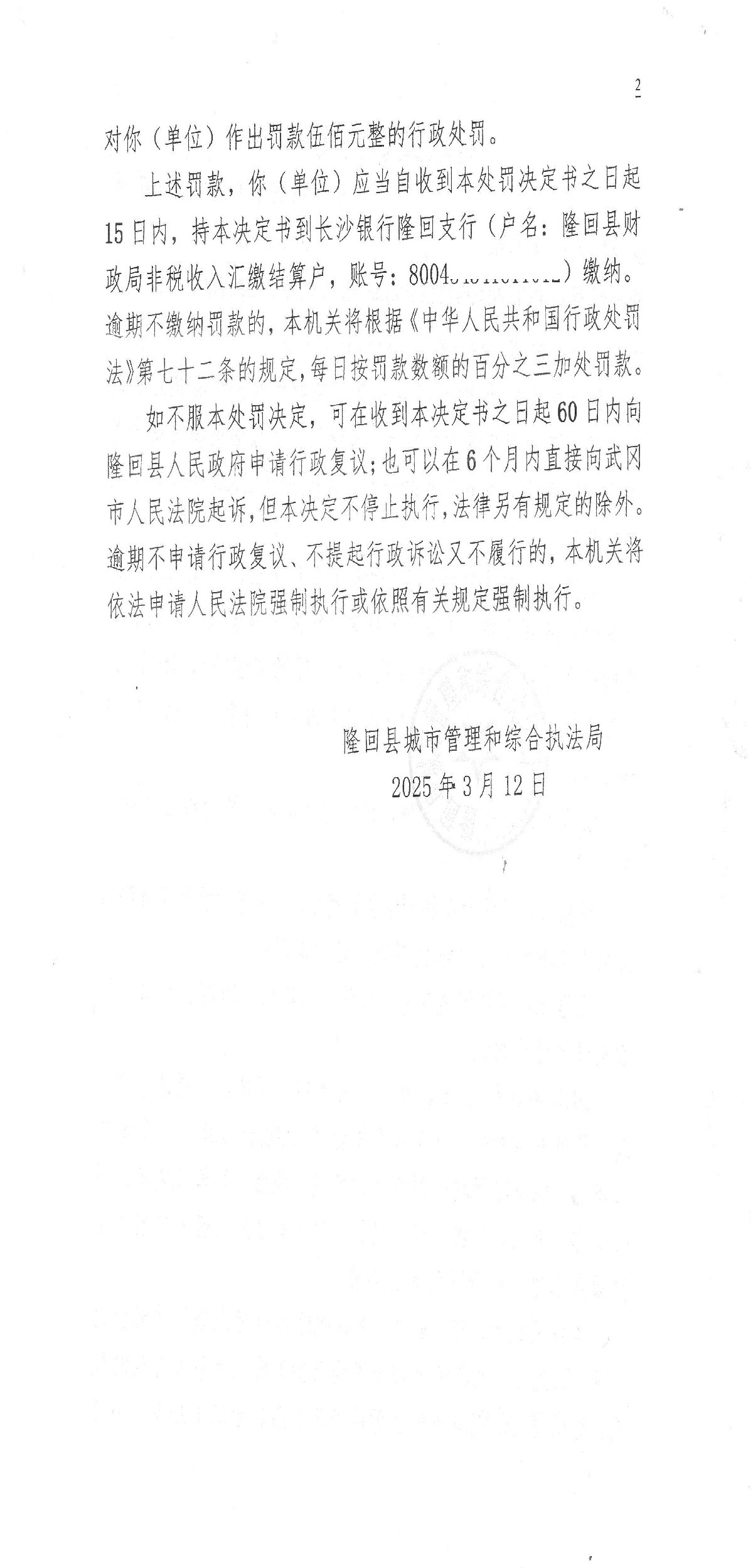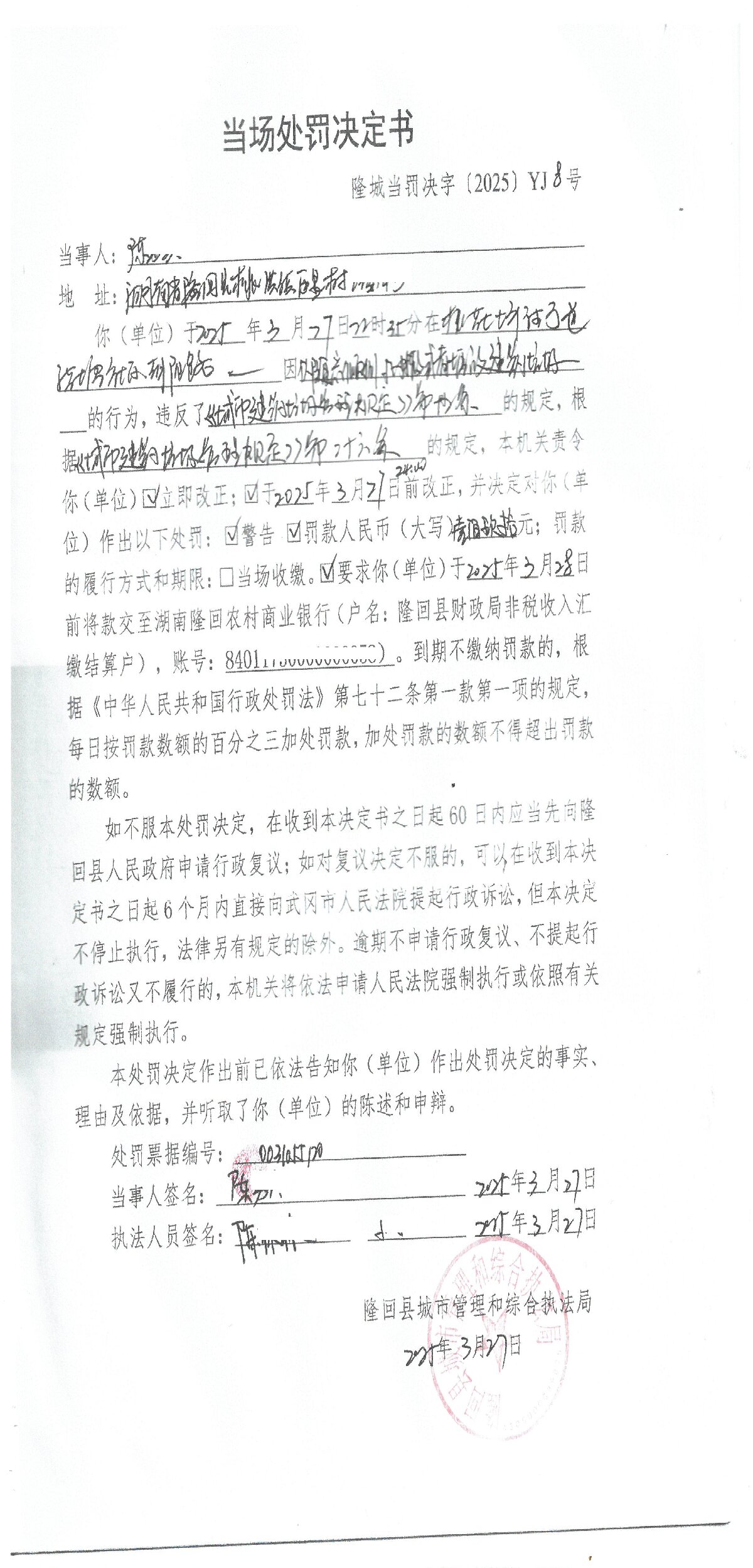 隆回县城市管理和综合执法局3月行政处罚决定书