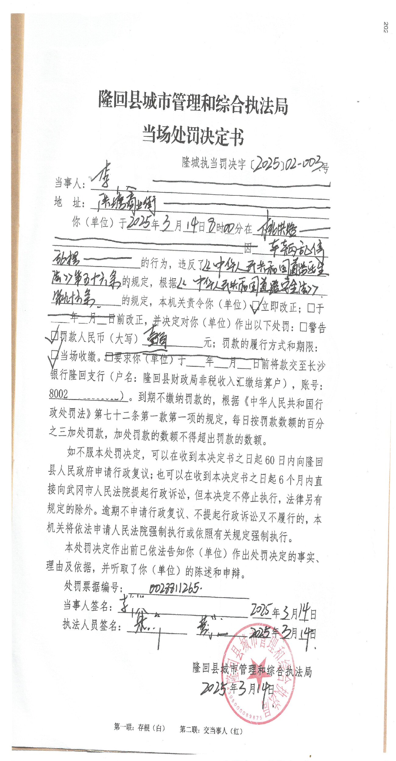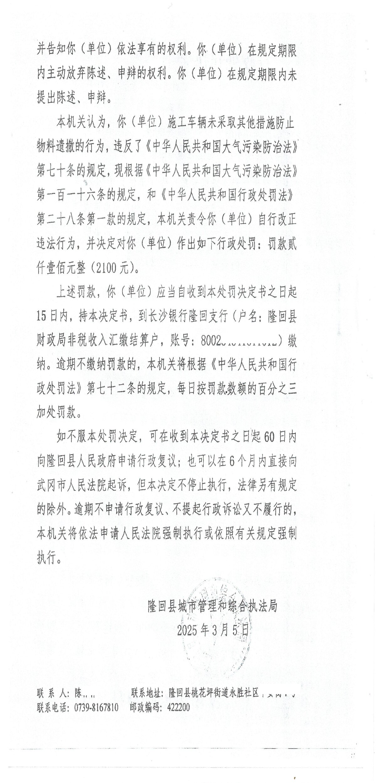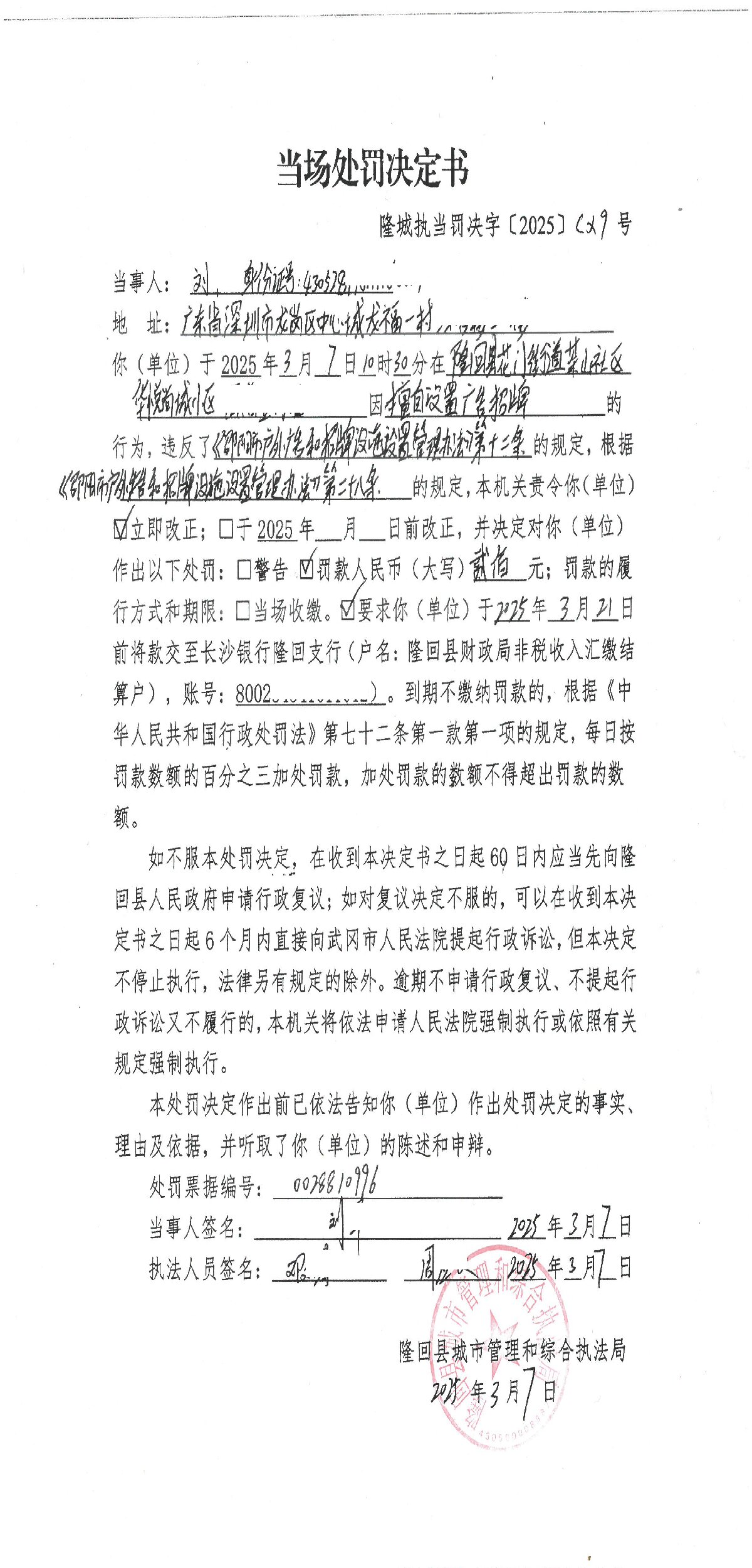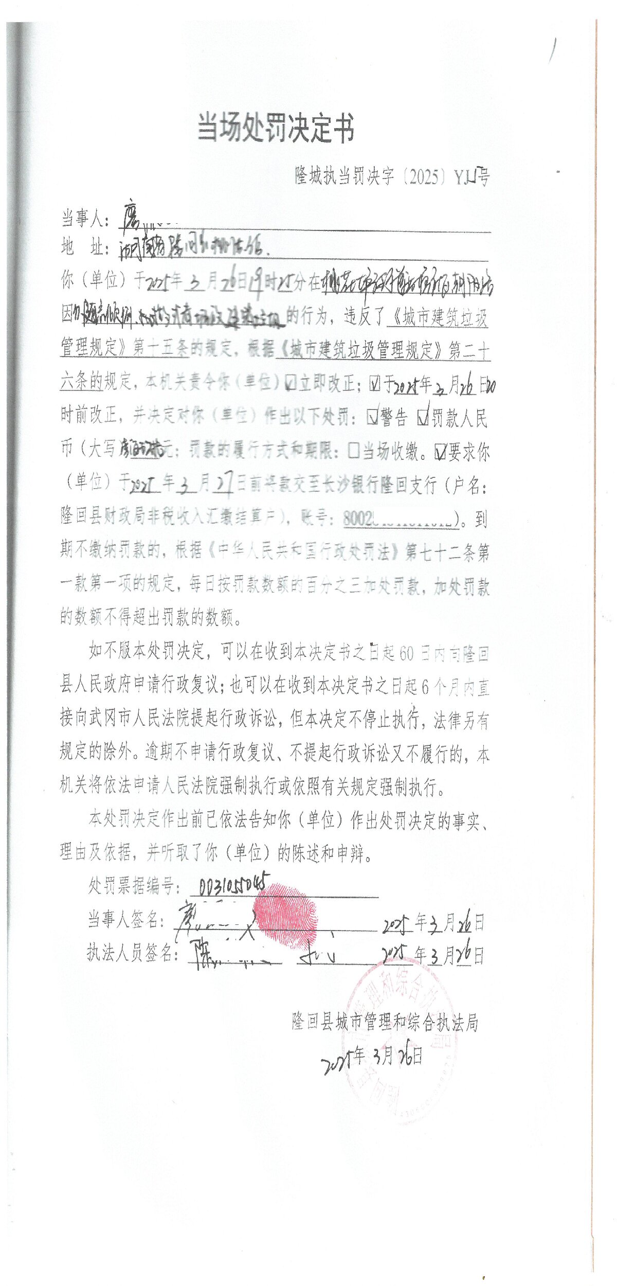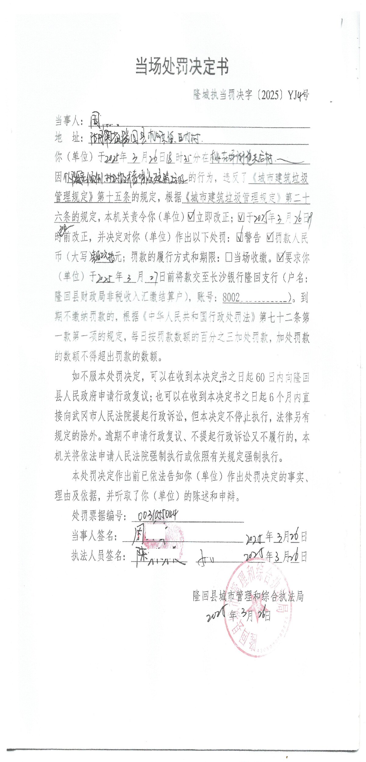 隆回县城市管理和综合执法局3月行政处罚决定书