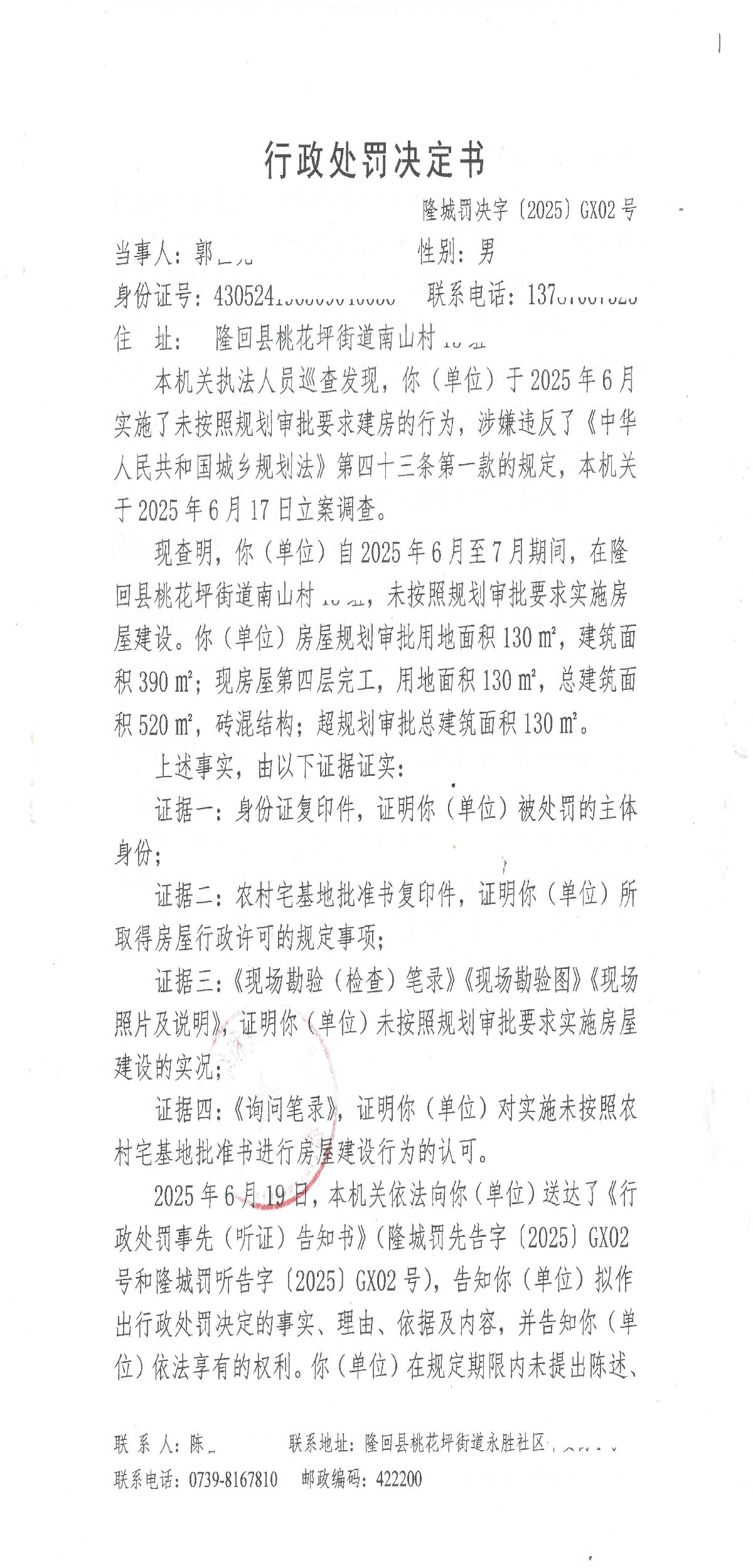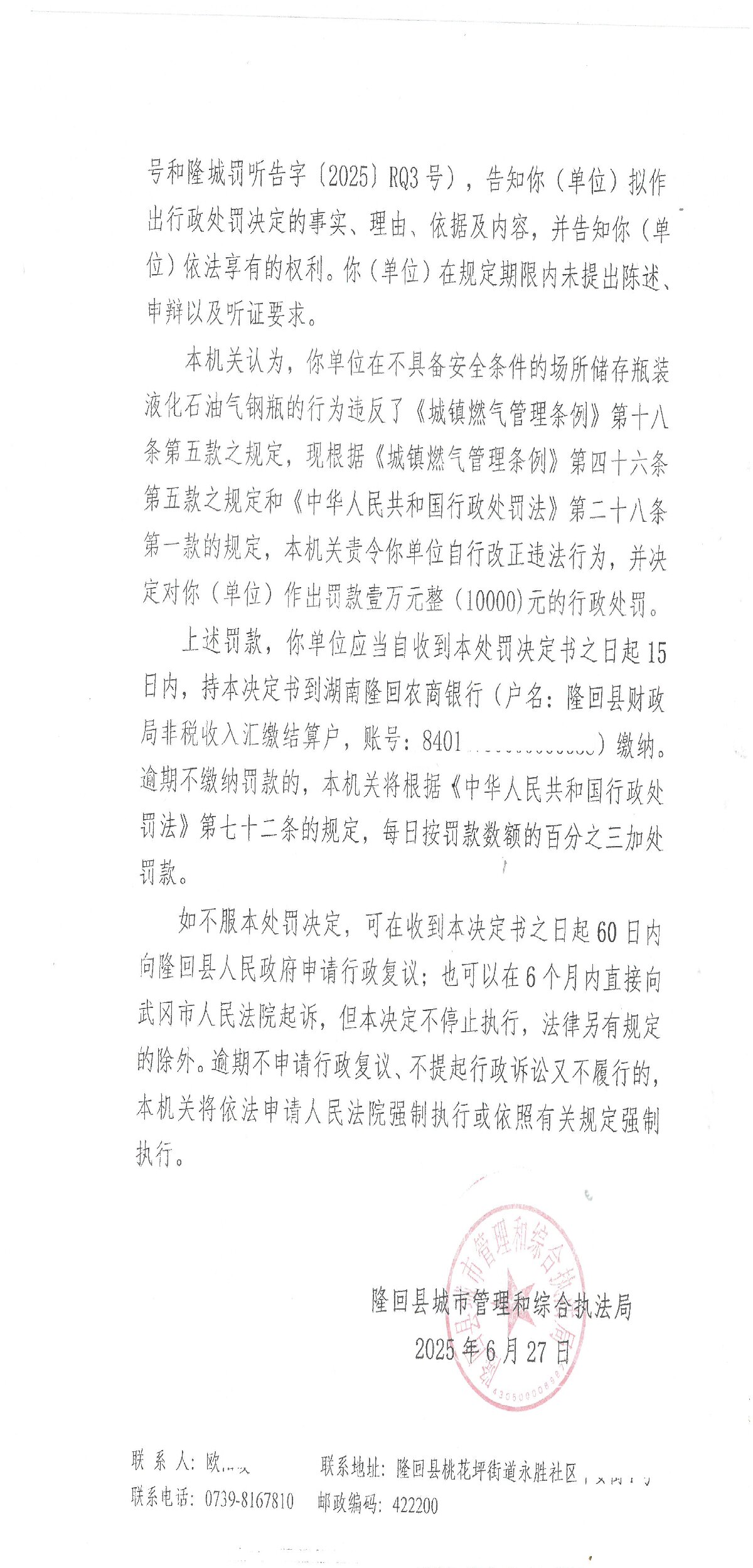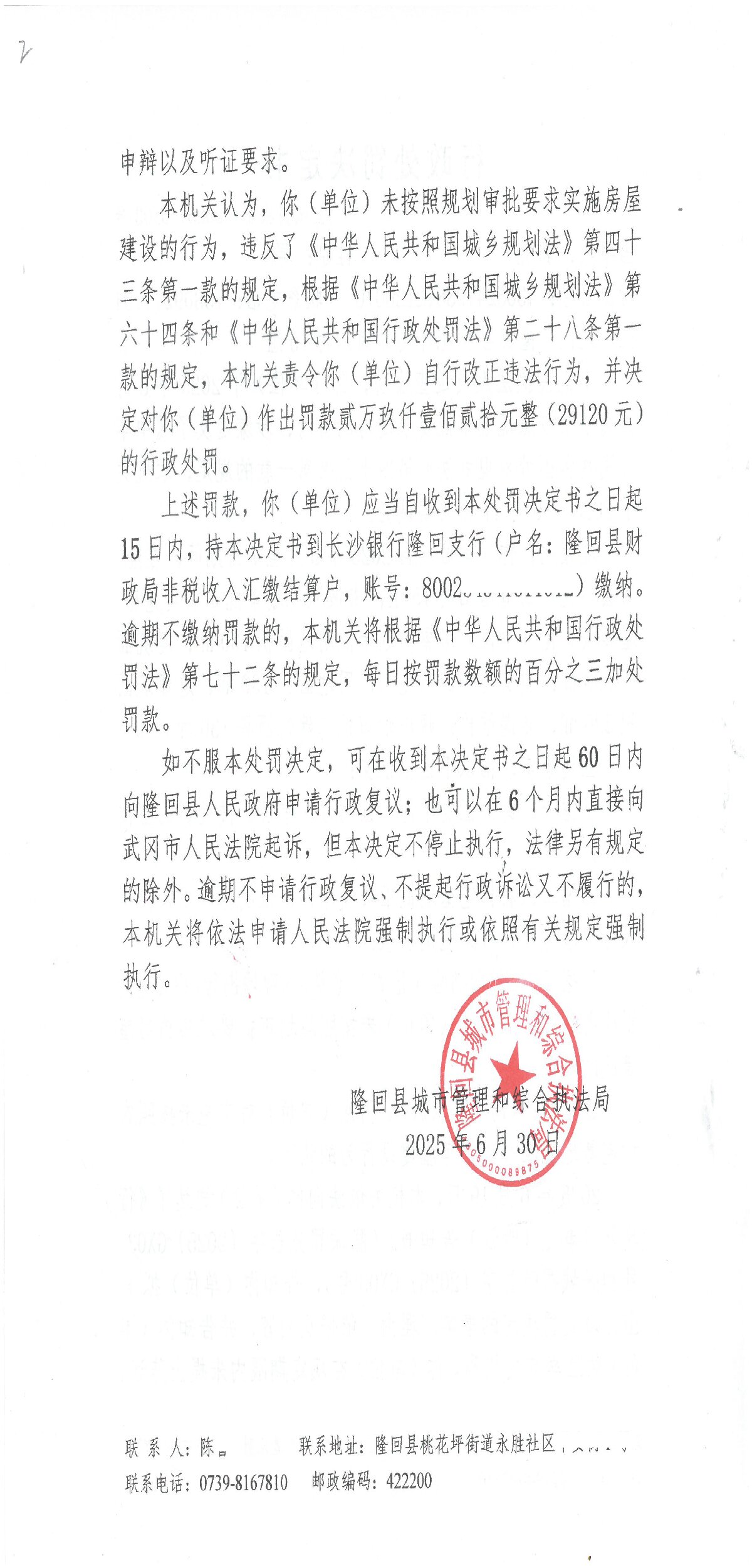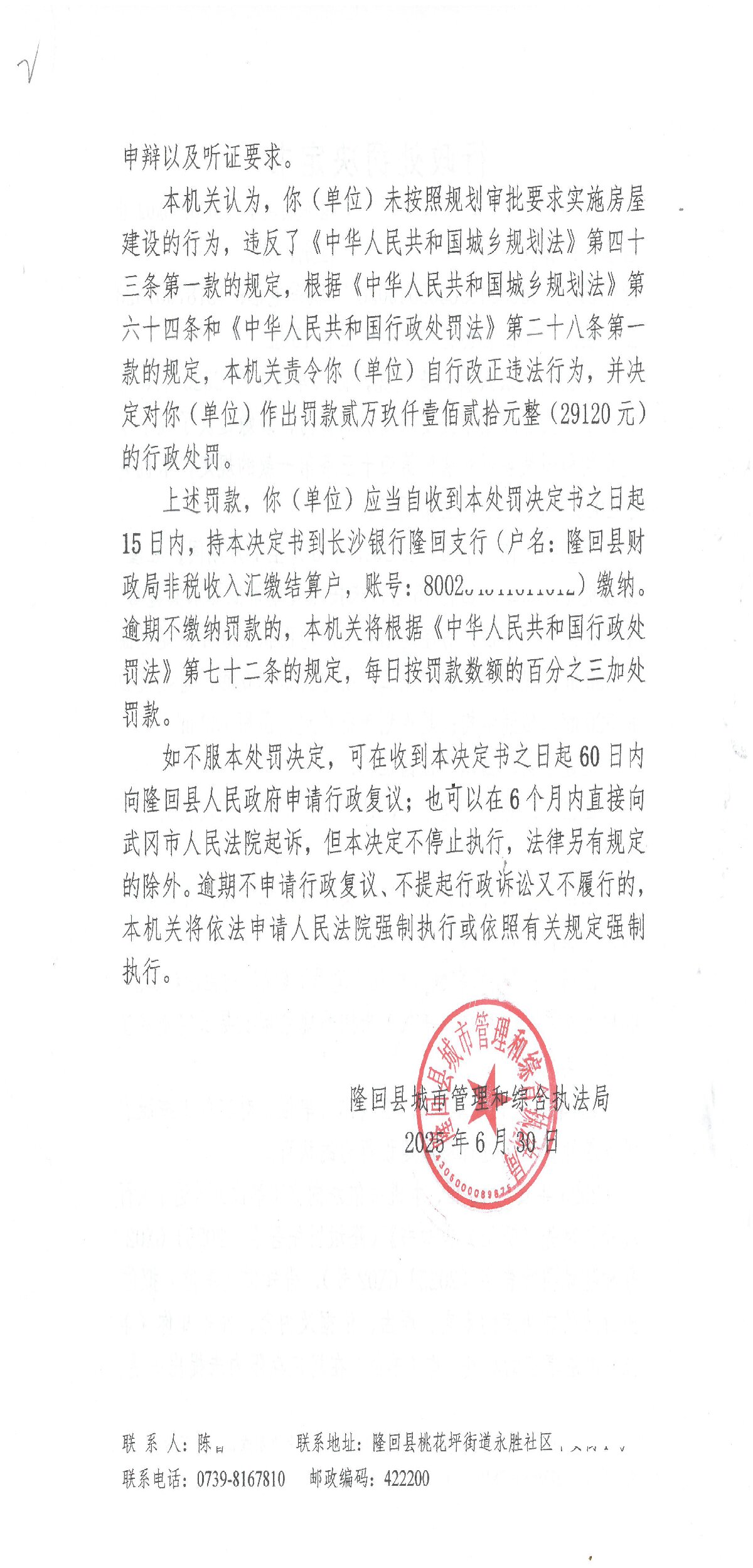 隆回县城市管理和综合执法局6月行政处罚决定书