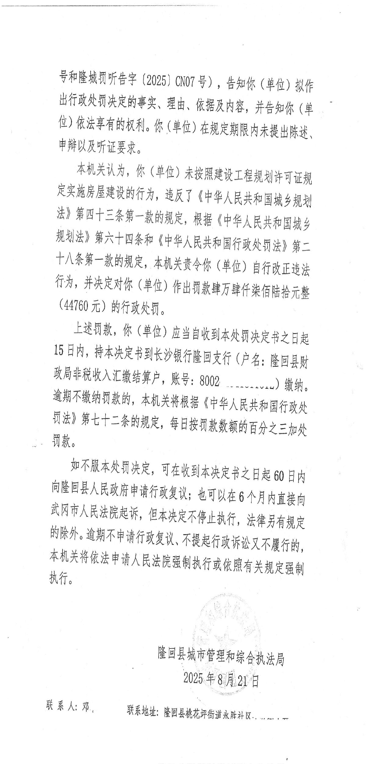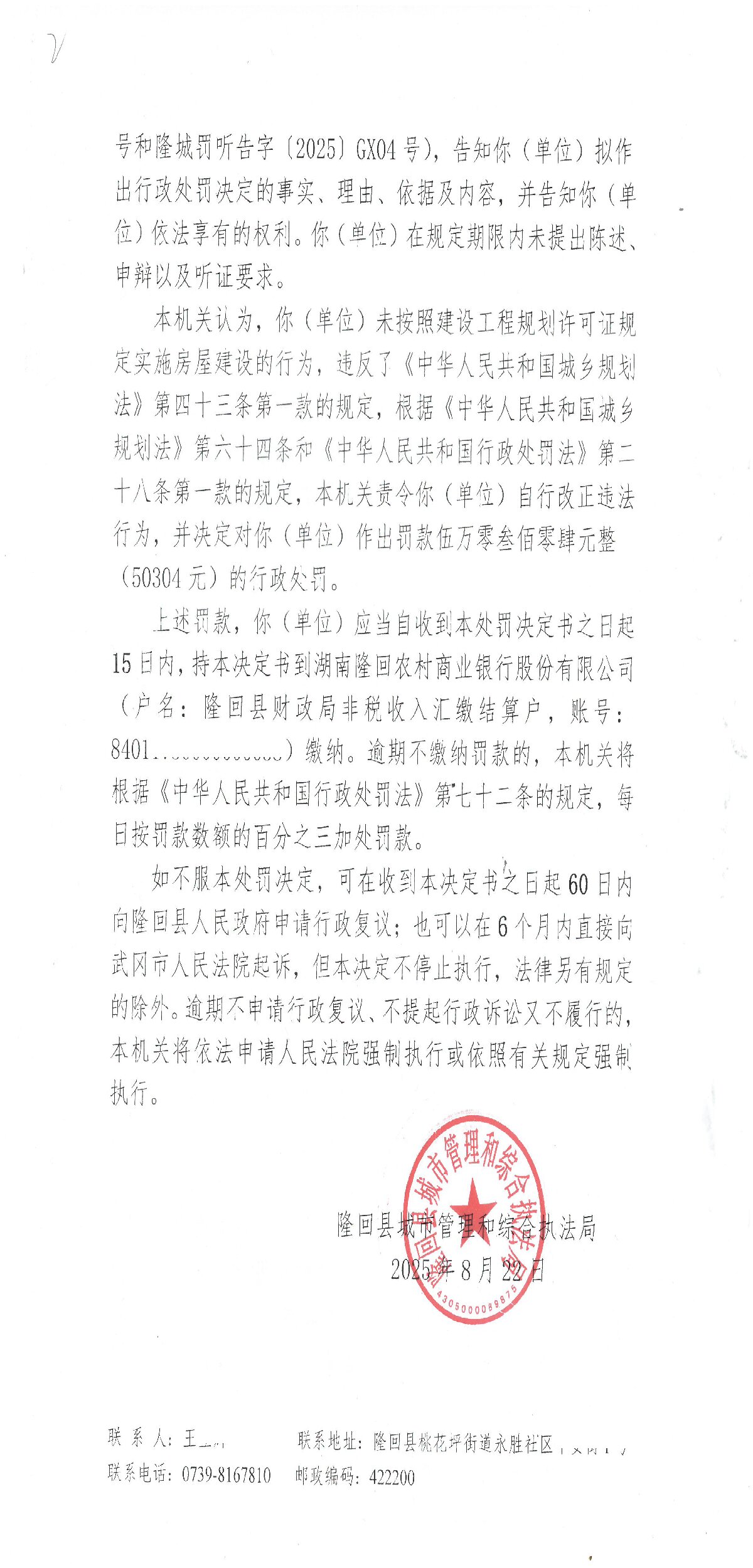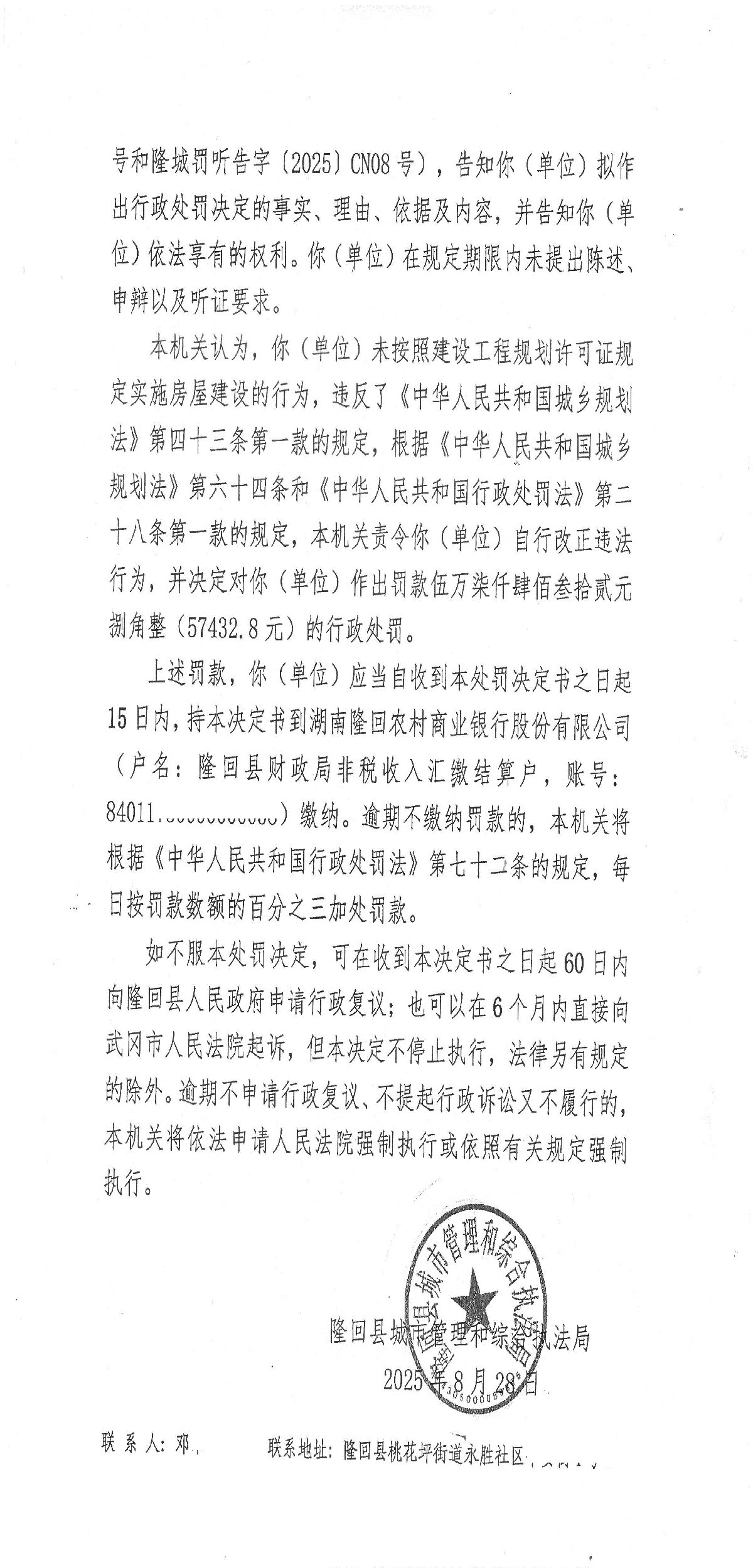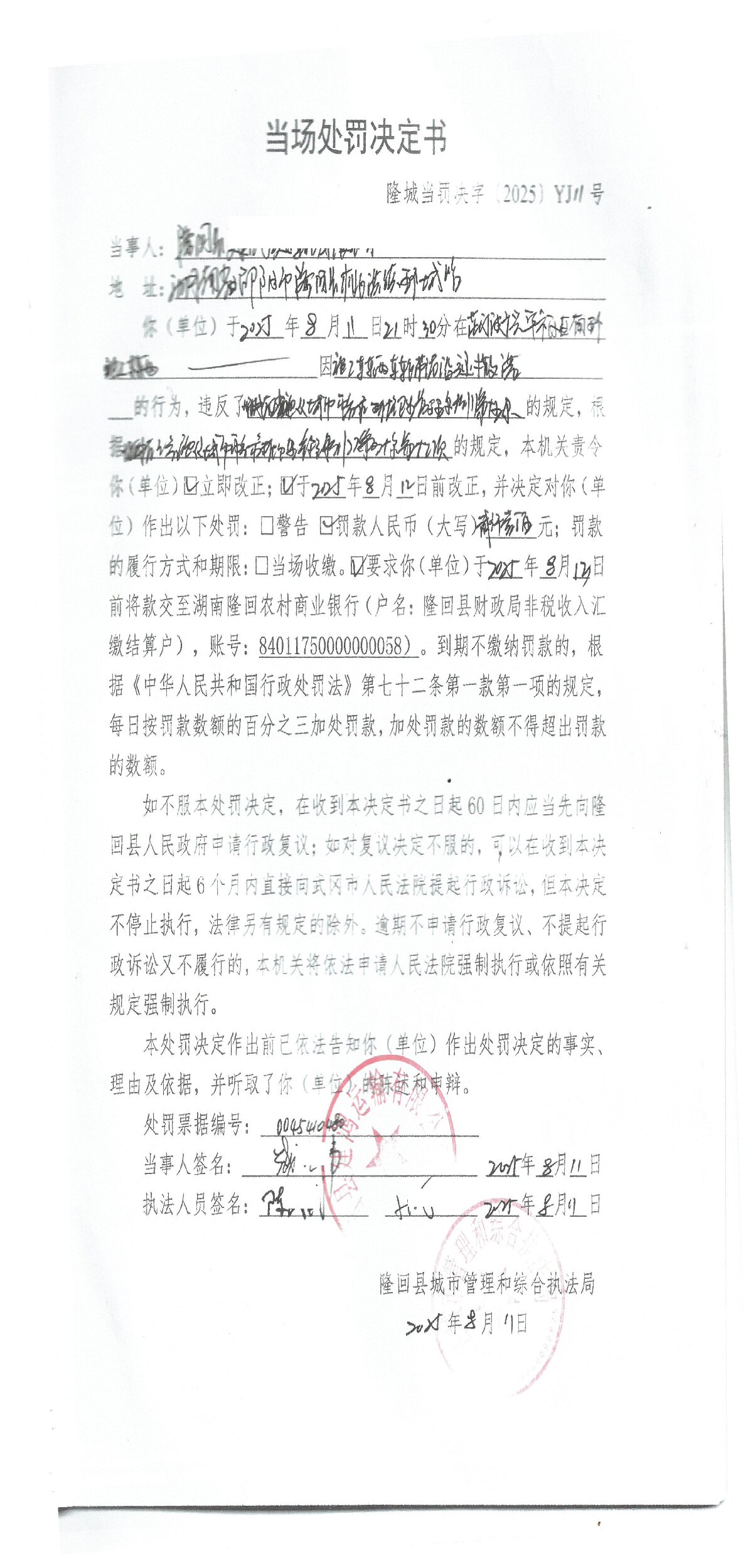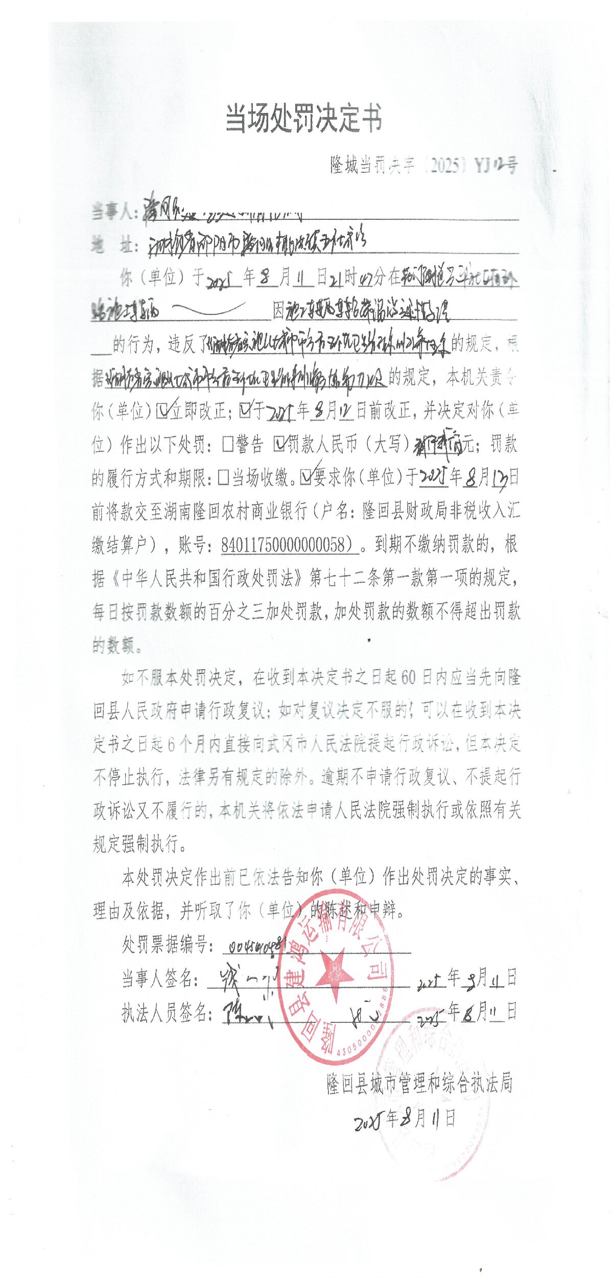 隆回县城市管理和综合执法局8月行政处罚决定书