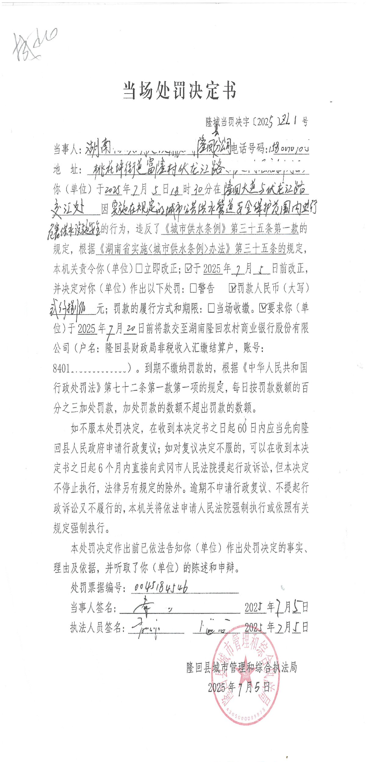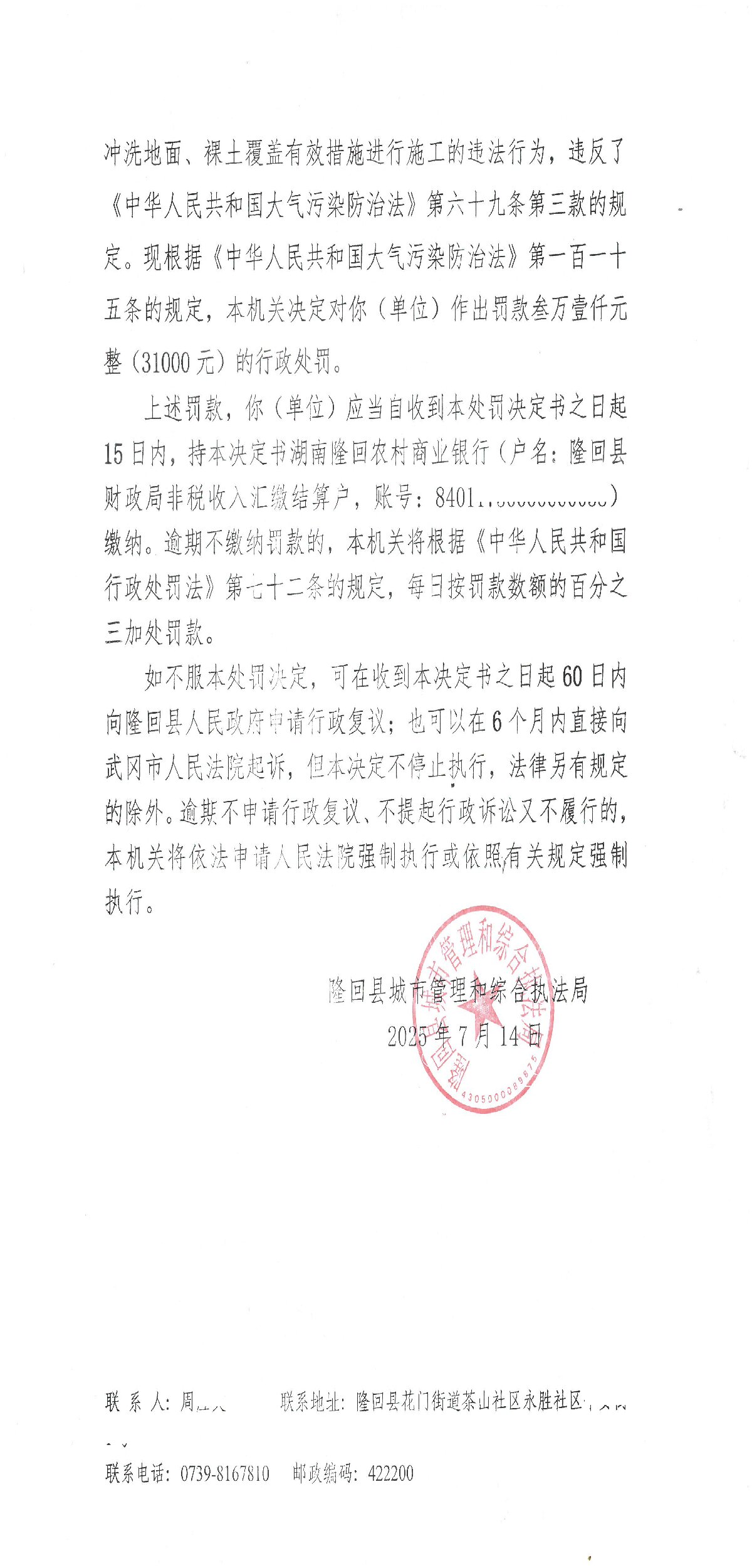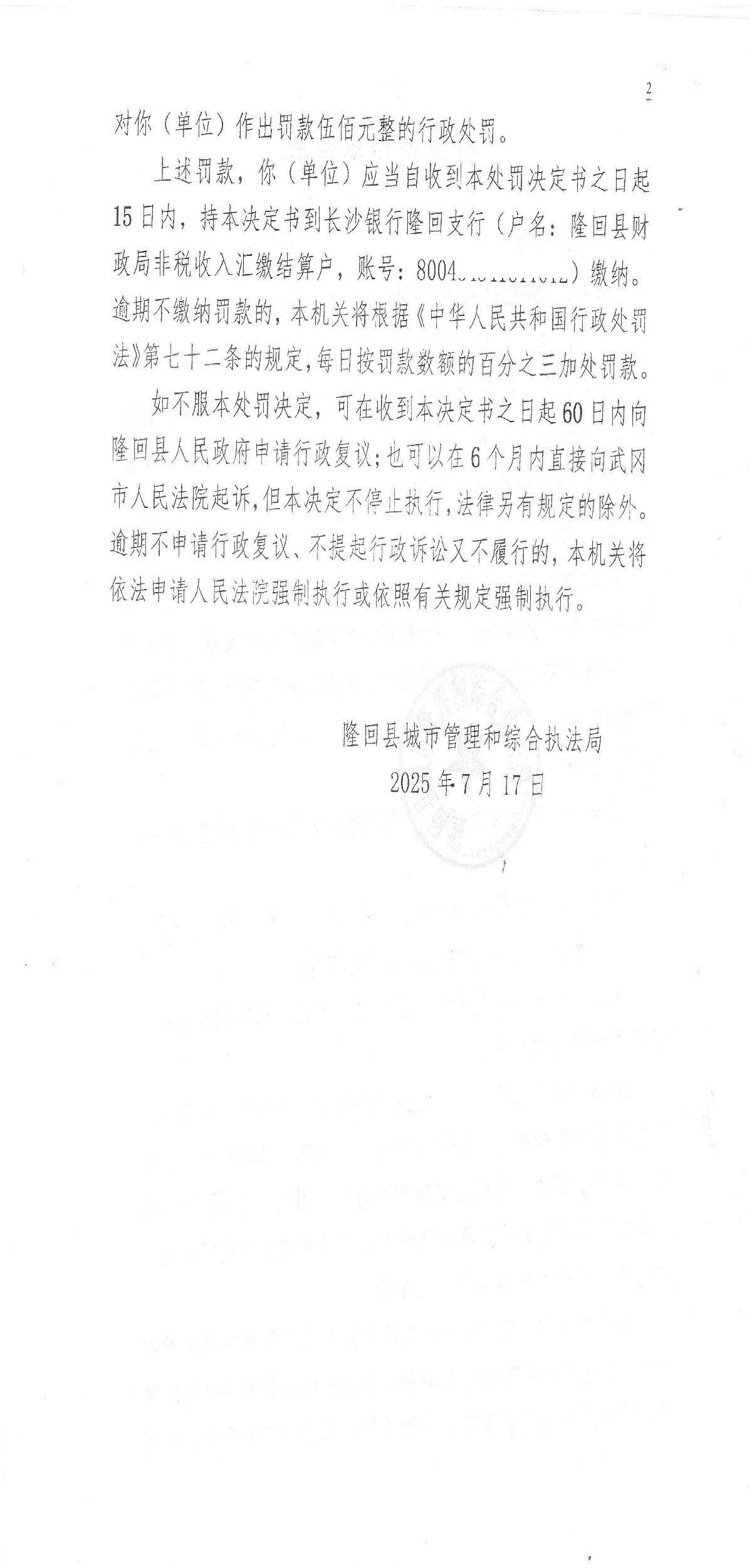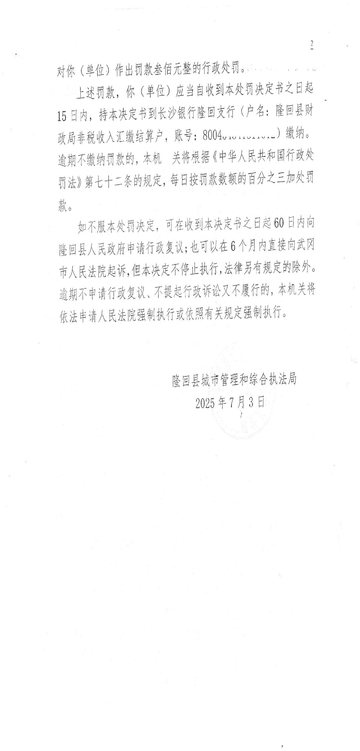 隆回县城市管理和综合执法局7月行政处罚决定书