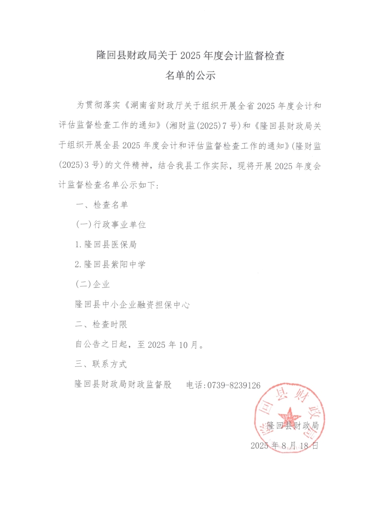 隆回县财政局关于2025年度会计监督检查名单的公示