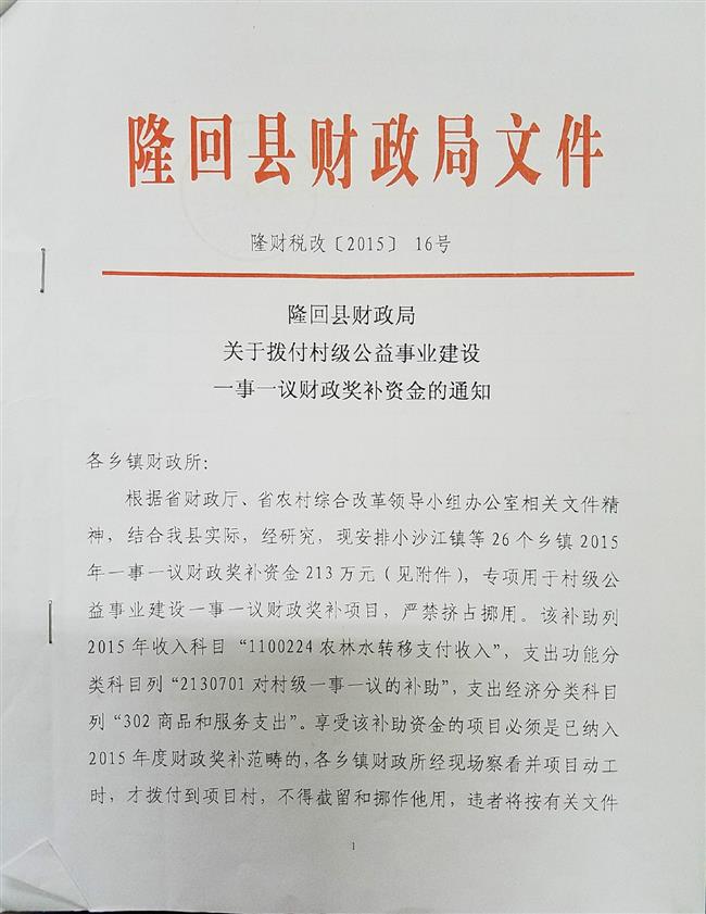 关于拨付村级公益事业建设一事一议财政奖补资金的通知