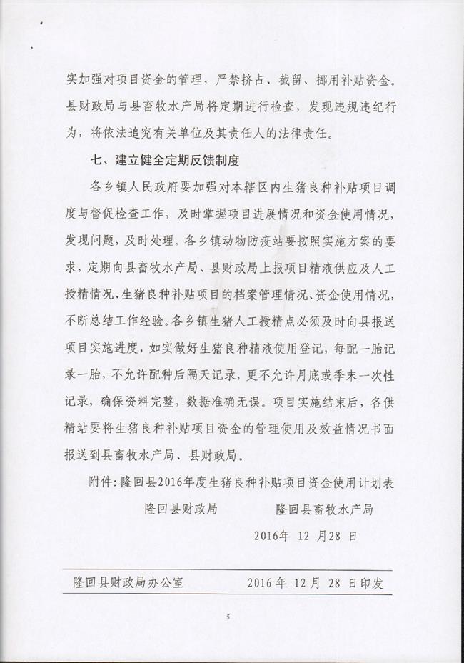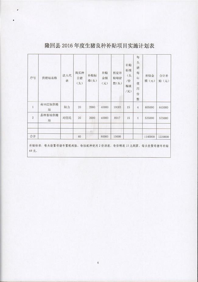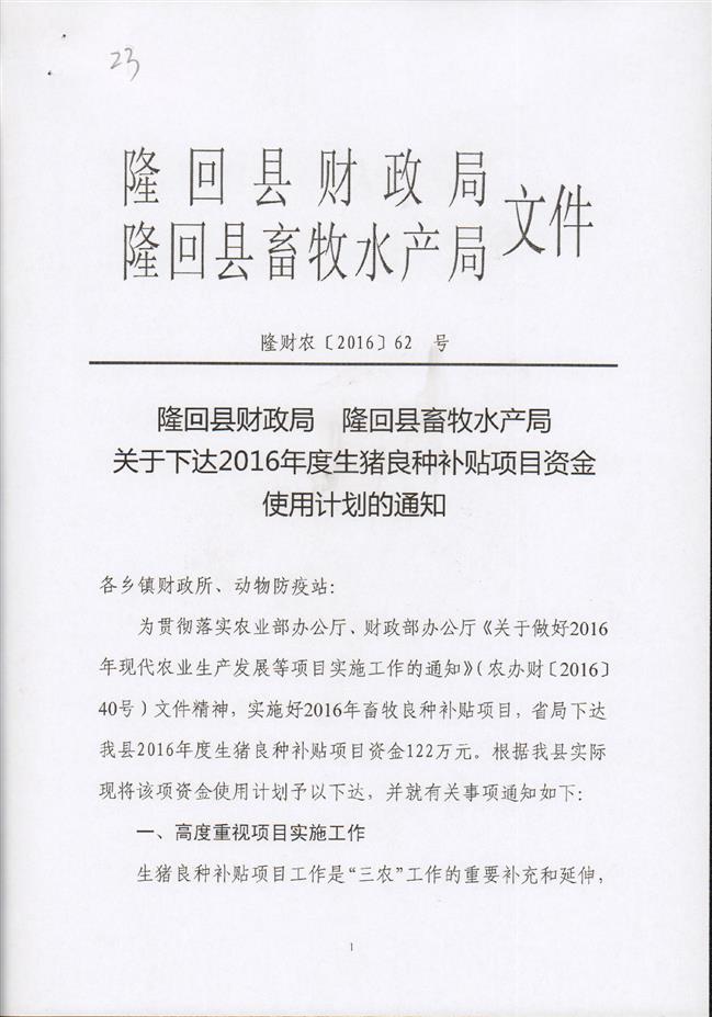 隆回县2016年生猪良种补贴