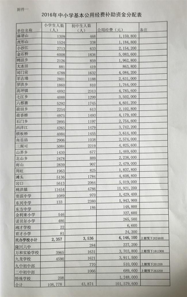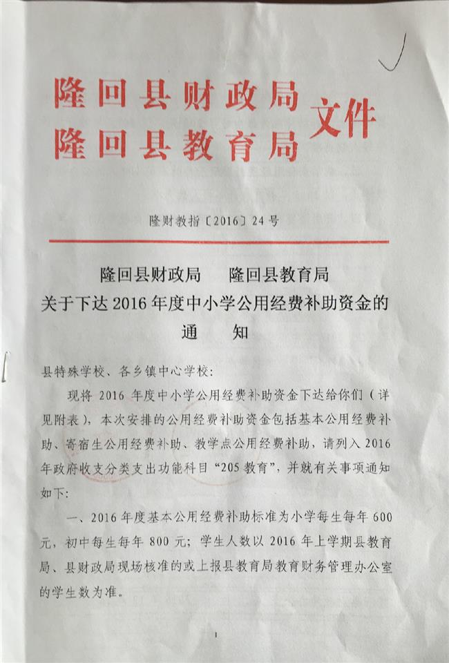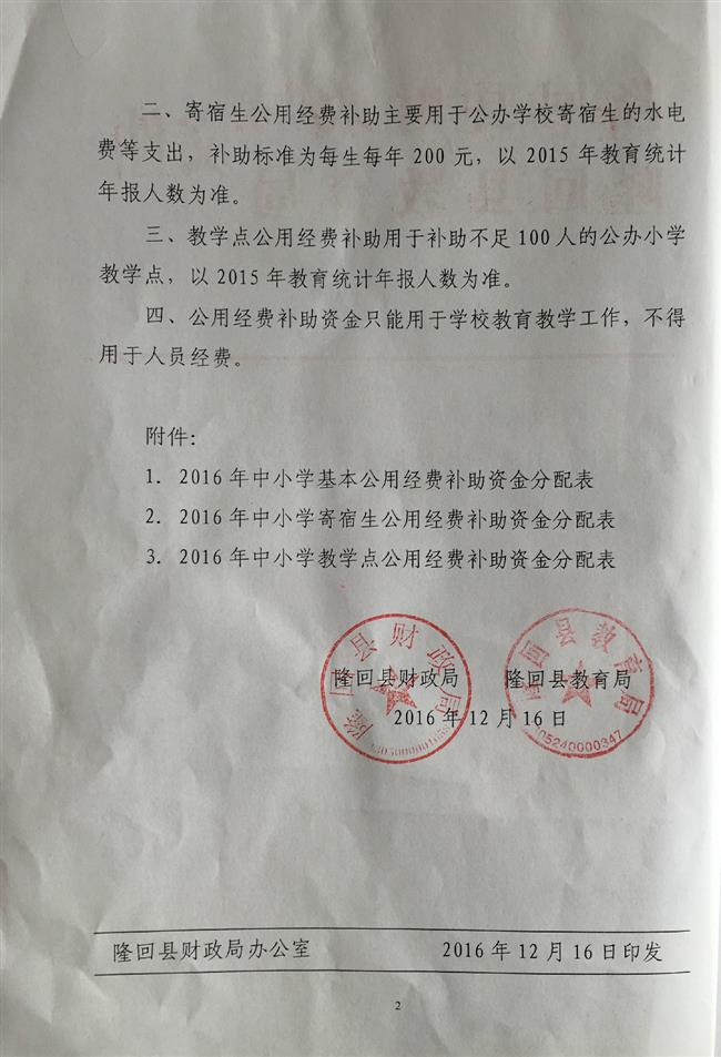 隆回县2016中小学公用经费补助