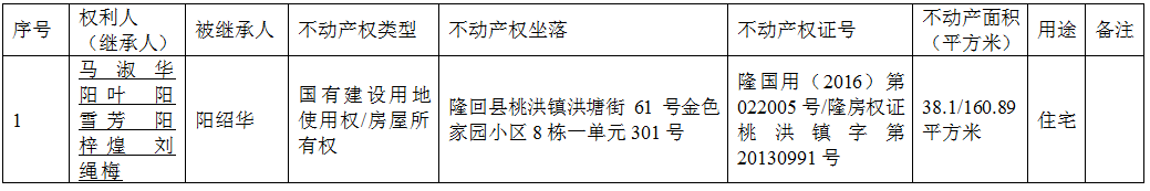 申请人 马淑华 阳叶 阳雪芳 阳梓煌 刘绳梅 因继承被继承人的不动产权,向我机构提供不动产权证书、亲属关系证明、死亡证明、具结书等证明材料,申请办理不动产权登记,经初步审核,我机构拟对下列不动产权予以登记,现予以公告,如有异议,请自本公告之日起十五个工作日内( 2020 年 8 月 27 日之前)将异议书面材料送达我机构,逾期无人提出异议或者异议不成立的,我机构将予以登记并颁发不动产权证书。