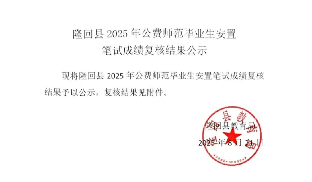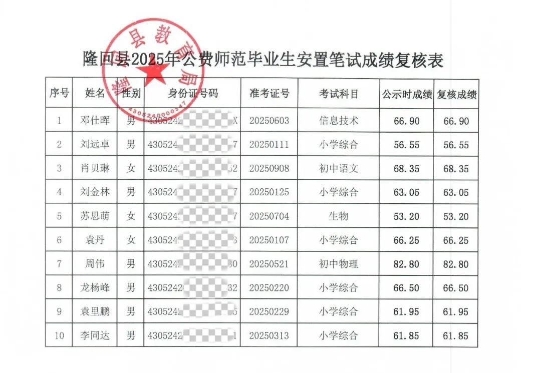 隆回县2025年公费师范毕业生安置笔试成绩复核结果公示