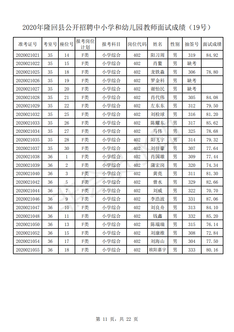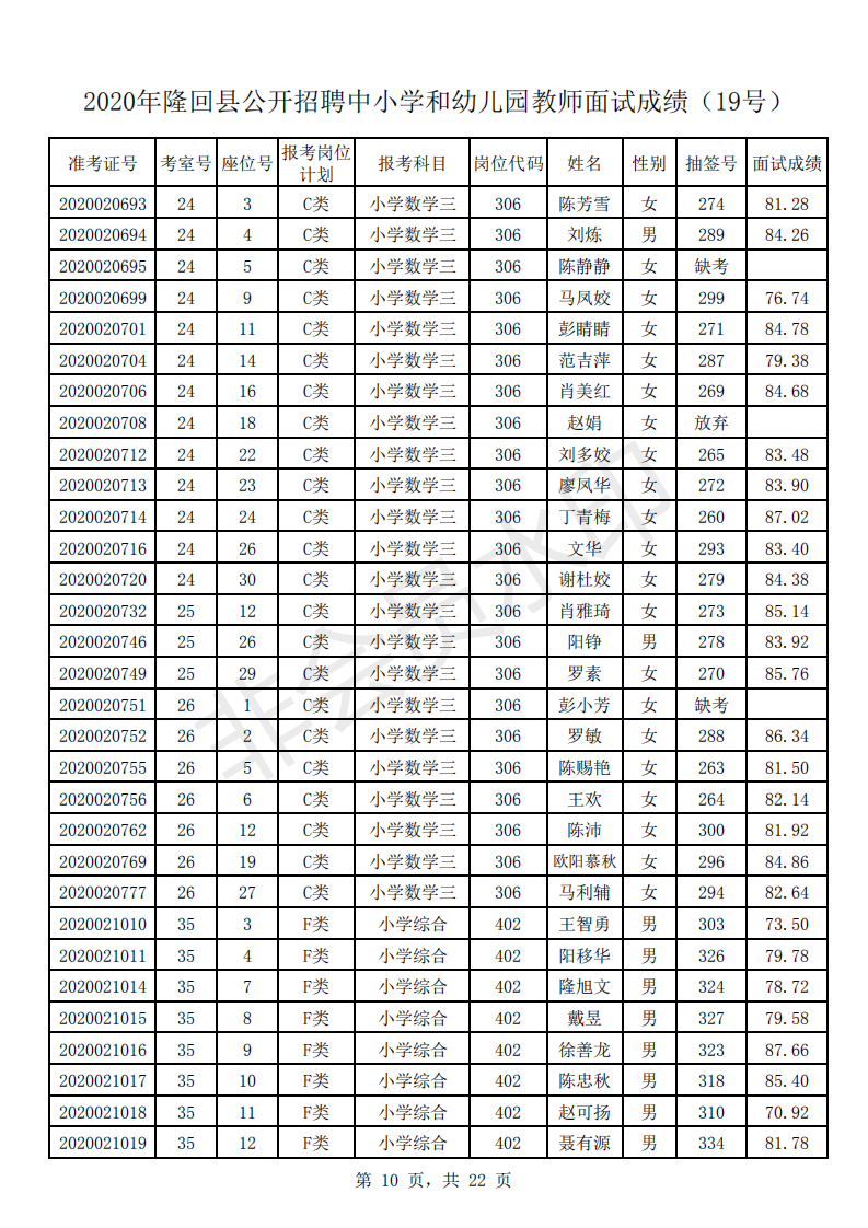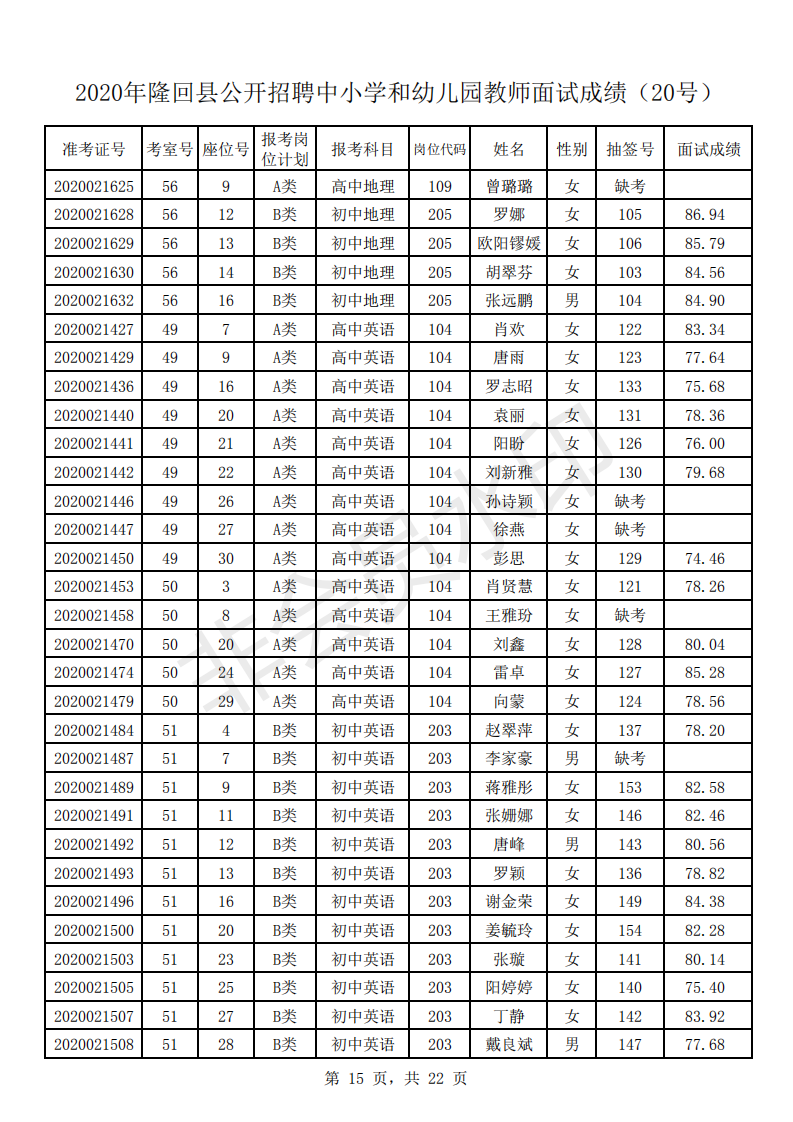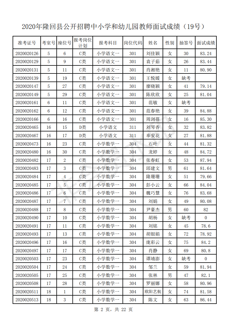2020年隆回县公开招聘中小学和幼儿园教师面试成绩公布
