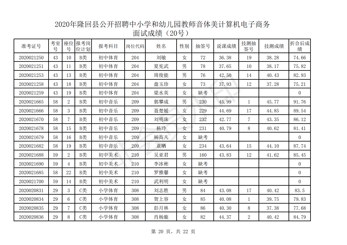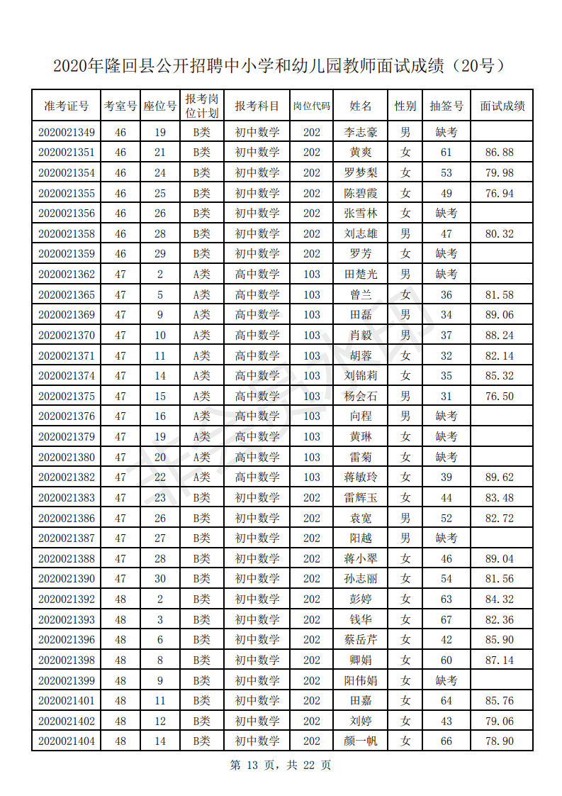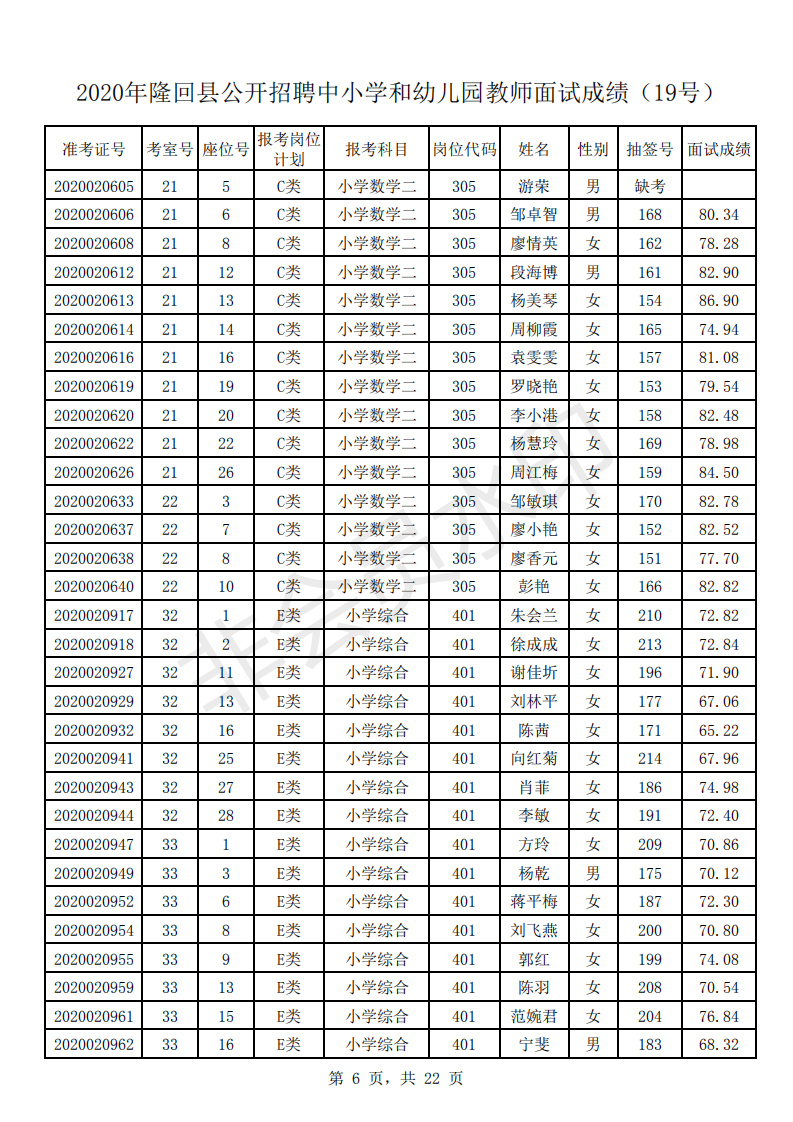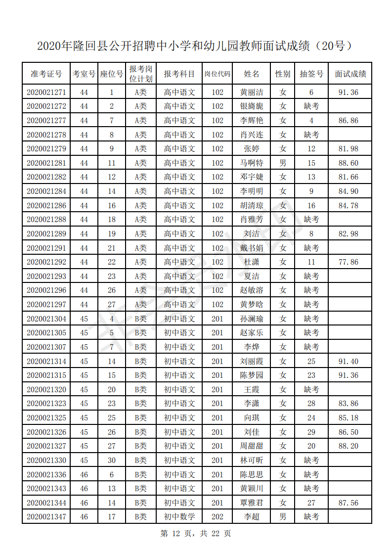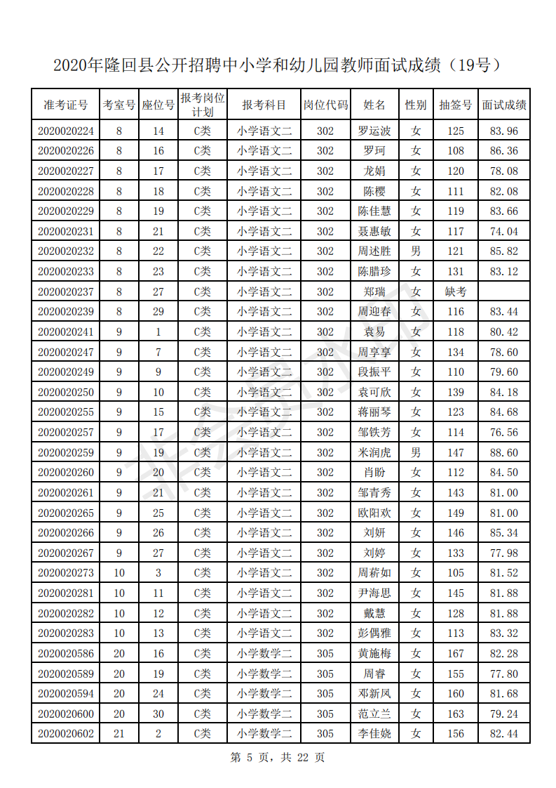 2020年隆回县公开招聘中小学和幼儿园教师面试成绩公布
