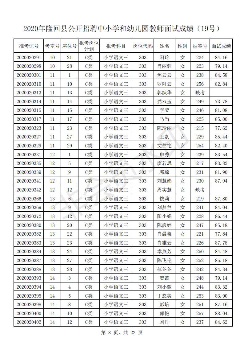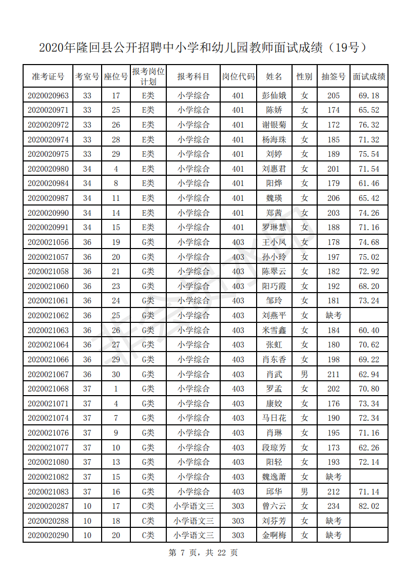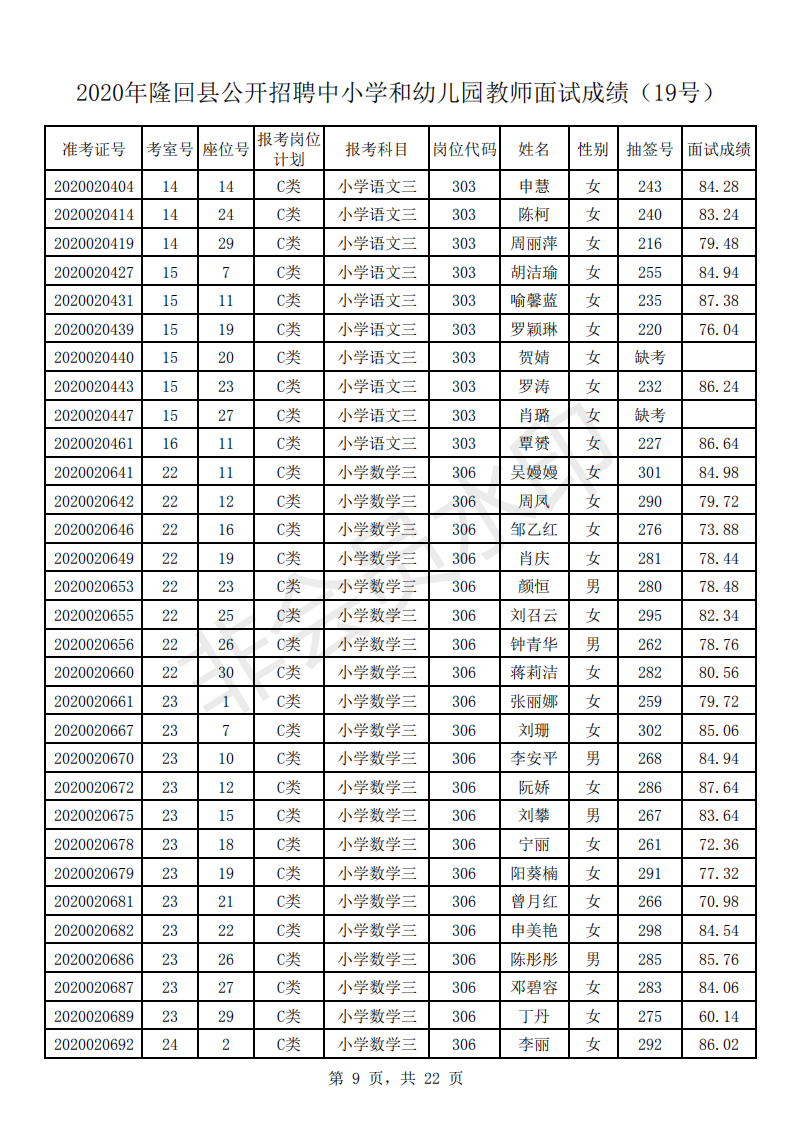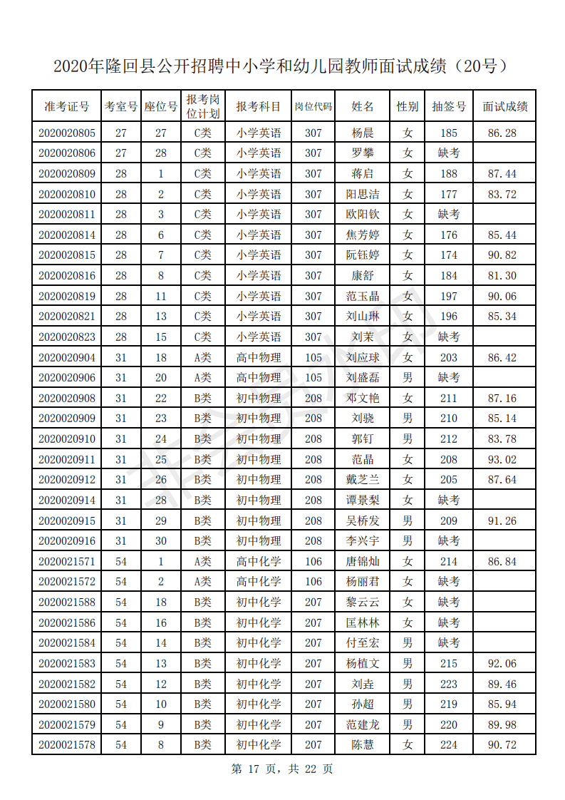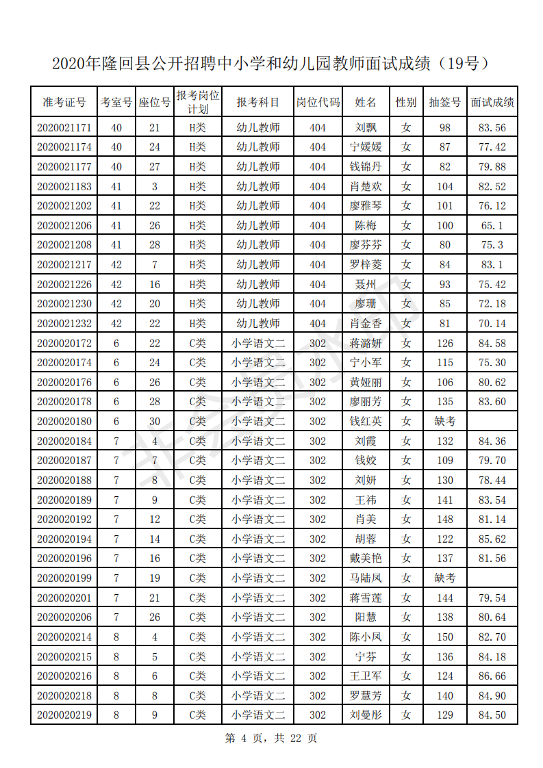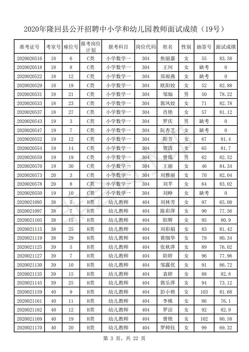 根据《2020隆回县公开招聘中小学和幼儿园教师公告》要求,我县于2020年8月19日-20日进行了面试,面试成绩予以公布(具体面试成绩见附件)
