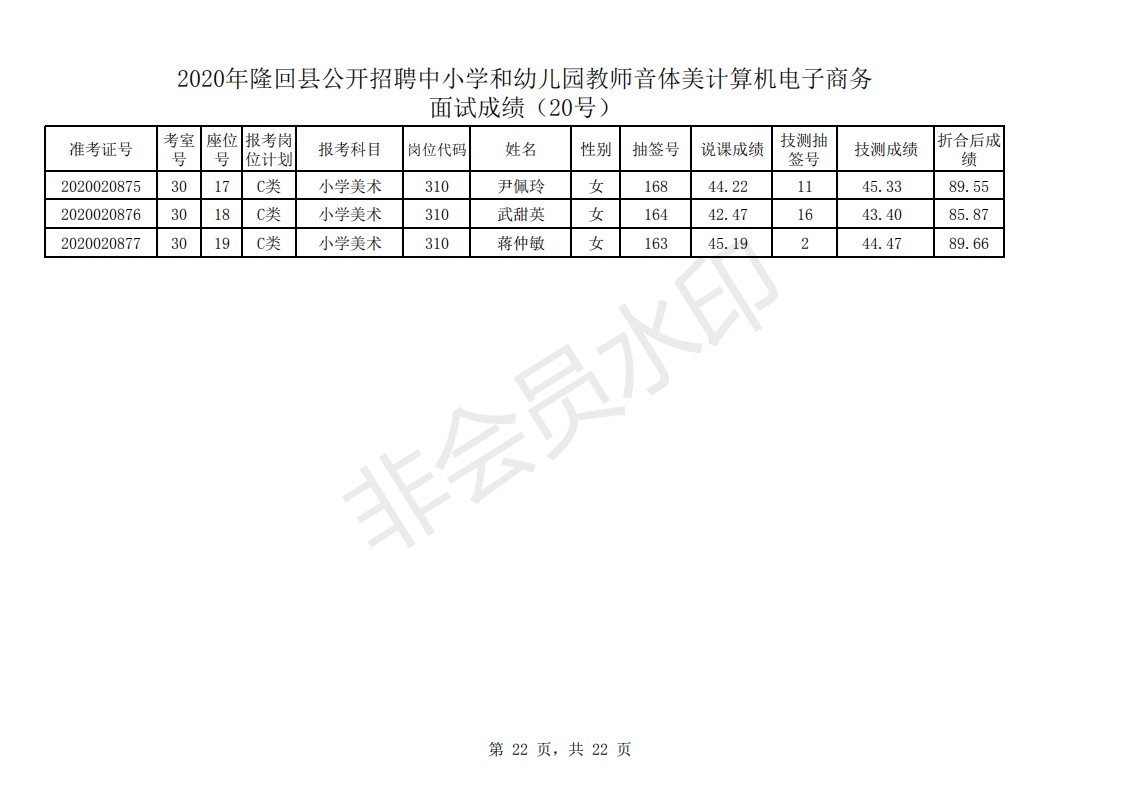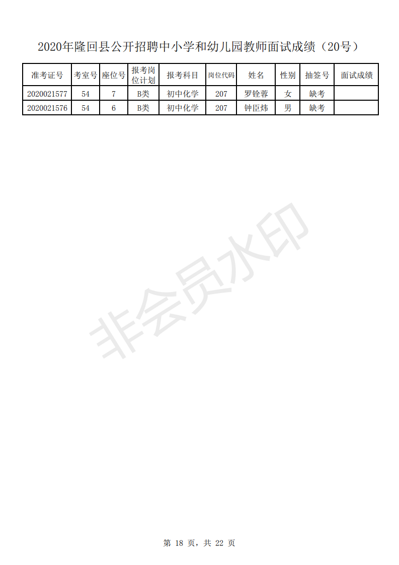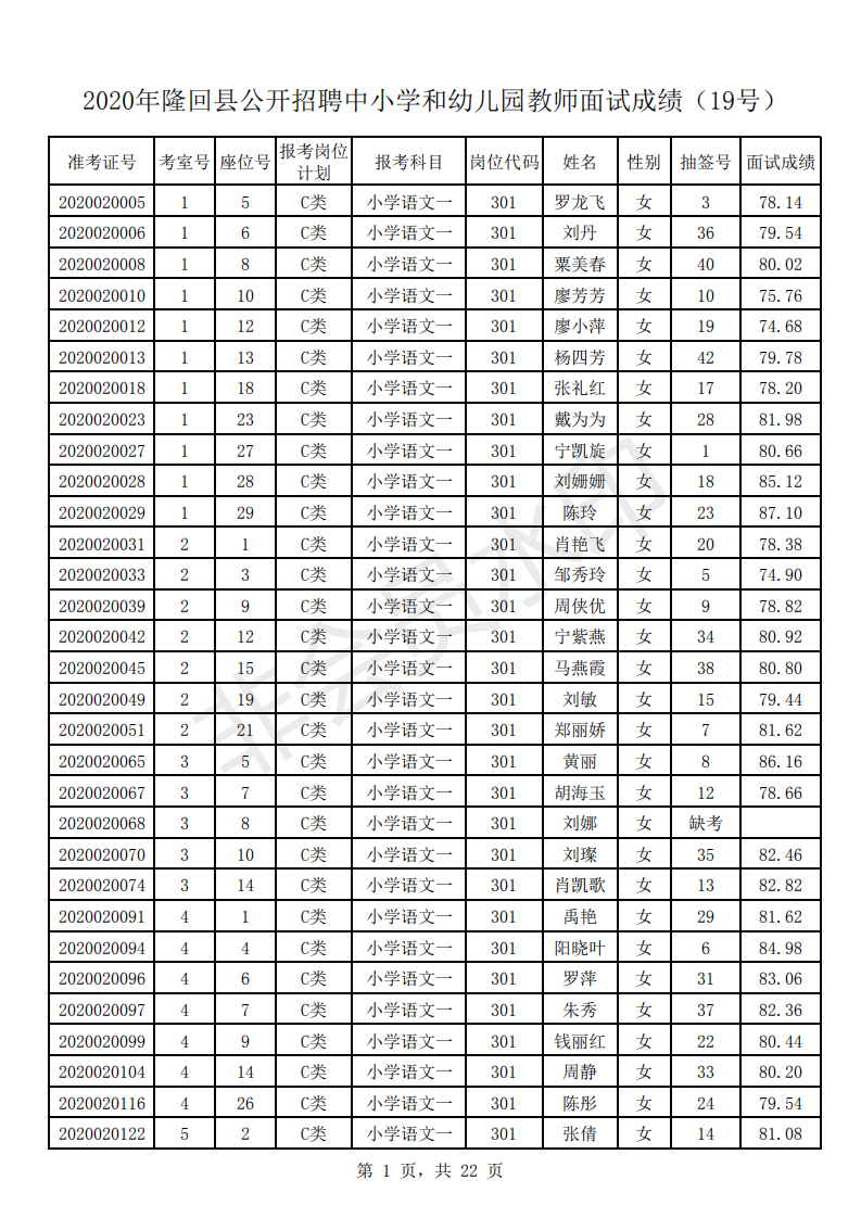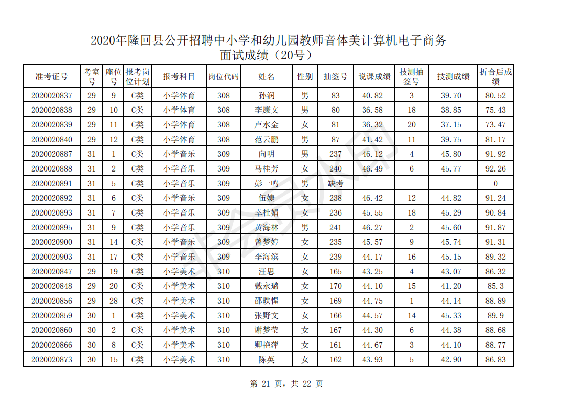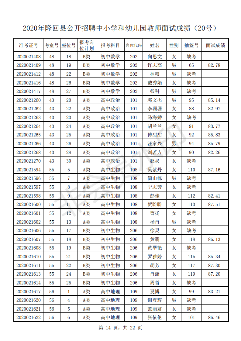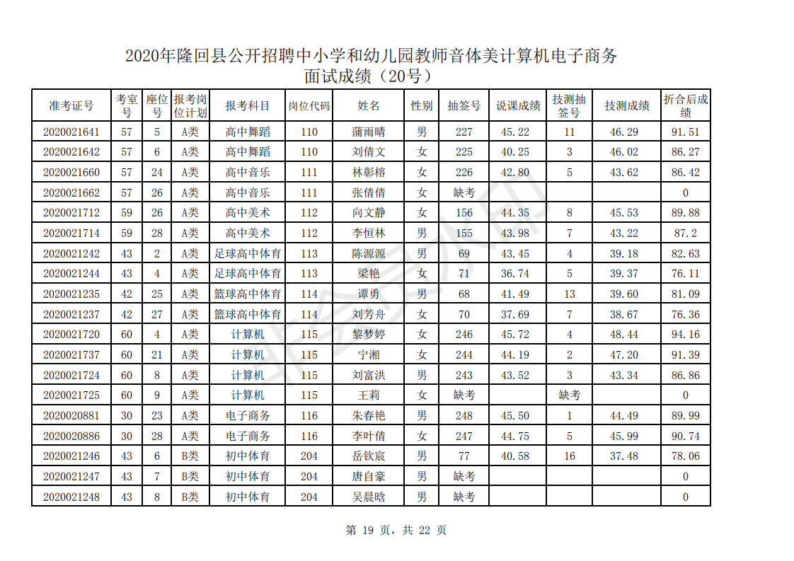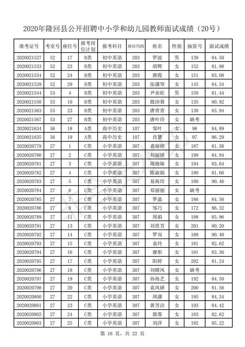 根据《2020隆回县公开招聘中小学和幼儿园教师公告》要求,我县于2020年8月19日-20日进行了面试,面试成绩予以公布(具体面试成绩见附件)