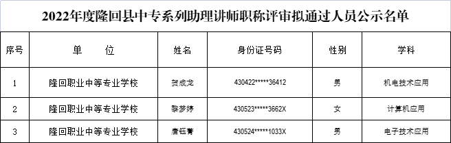 附件:2022年度隆回县中专系列助理讲师职称评审拟通过人员公示名单