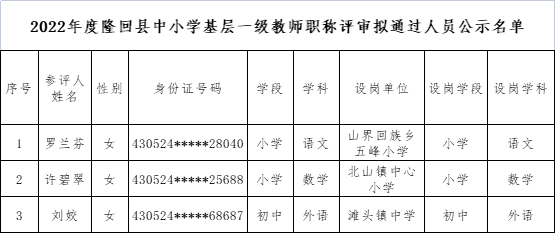 罗兰芬等3位同志(名单附后)已于2022年12月21日经隆回县中小学教师一级专业技术职务评审委员会评审通过,现予公示。公示时间为5个工作日(2022年12月23日至2022年12月29日)。