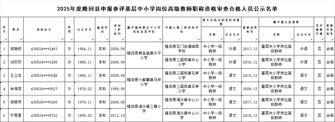 对照邵阳市2025年基层中小学岗位高级教师职称设岗计划,经教师个人申报,学校考核推荐,县教育局和县人社局审核,郑艳娇等6位同志符合申报2025年度隆回县基层中小学岗位高级教师职称评审条件,现予以公示。公示期为5个工作日,从2025年9月3日至9日。公示期间,如有不同意见,请实名以来电、来信、来访等方式向县纪委监委驻县教育局纪检监察组或县教育局政工股反映。