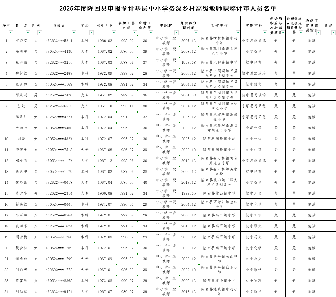 经教师个人申报,学校考核推荐,宁晓春等24位同志申报2025年度基层中小学资深乡村高级教师职称评审。现予以公示,公示期为5个工作日,从2025年9月3日至9日。公示期间,如有不同意见,请实名以来电、来信、来访等方式向县纪委监委驻县教育局纪检监察组或县教育局政工股反映。