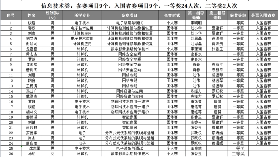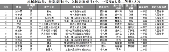 在本次市赛中,该校共有67名学生参与本次大赛23个项目的角逐,共19个项目获得46个一等奖,获奖人次46人;8个项目获得21个二等奖,获奖人次21人;其中有19个项目顺利入围省赛。据统计,本次比赛,该校一等奖获奖项目占省赛总项目的46.3%。无论是获奖面、获奖数量还是获奖质量,再次实现了历史性突破,成果位居兄弟学校前列,得到了上级领导、社会、兄弟学校的高度赞誉。