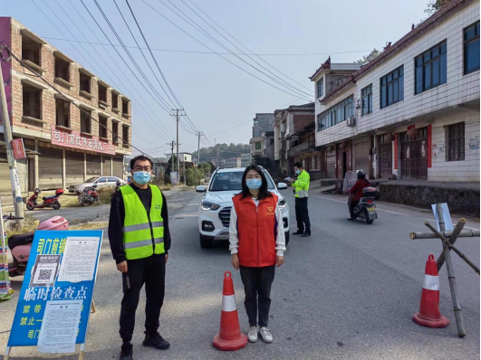 图为谭华、陈永丽及交通部门的同志在石阳桥卡点