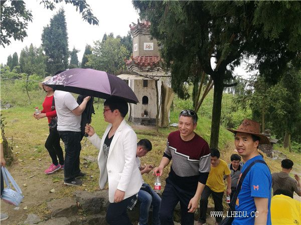 中午13:20,教职工们乘车8公里来到芙蓉山下瞻仰烈士纪念碑,缅怀烈士的事迹,品读烈士的信仰和不朽。13:40,开始登山。大家延着山路蜿蜒而上,两旁的树木葱郁、竹子滴翠、鸟儿欢鸣。彼此边走边谈笑着,汗珠凝聚在鼻尖,兴奋洋溢在脸上。路随山转,人在林中行。随着山路的陡峭和延伸,汗水在脸上肆意流淌,浸湿了衣衫,但大家感觉到的是轻松、愉快,欢声笑语回荡在山风中,工作中的压力和紧张得到了尽情地释放。15时许,大家登上了芙蓉山顶,来到望云寺,红红的脸上盛满喜悦。