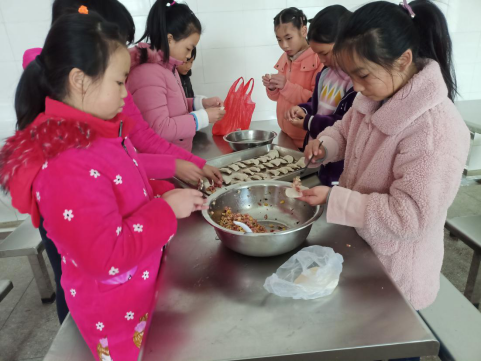 11月30日中午,在姜老师的带领和组织下,岩口镇划市小学五年级全体学生在学校厨房进行了包饺子班级活动。