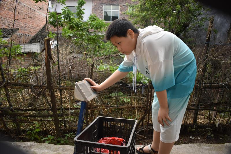 从2019年暑假开始,早上六点,周柏麟便起床叠好被,步行十分钟左右,来到荷香桥镇S219国道摊位前熟练的帮父亲撑帐篷伞,到摊位附近的四伯家将寄存的西瓜搬到摊位上摆放好,目不转睛的盯着路上往来的人群与车辆。当有客人来买瓜时,他会熟练的挑瓜、打称,精确的算账、找零,动作十分熟练。