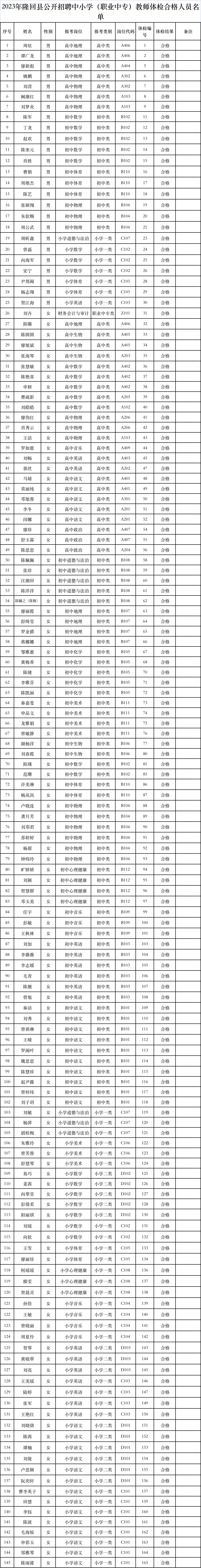 根据《2023年隆回县公开招聘中小学(职业中专)教师公告》,通过笔试、面试、体检等程序,现将体检合格人员名单予以公布(见附表)