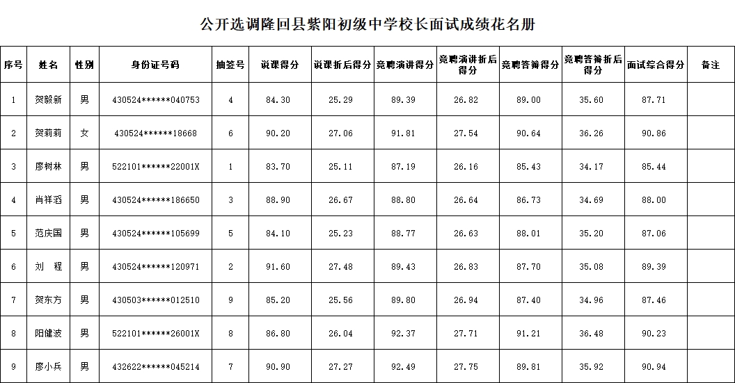 附件:公开选调隆回县紫阳初级中学校长面试成绩花名册