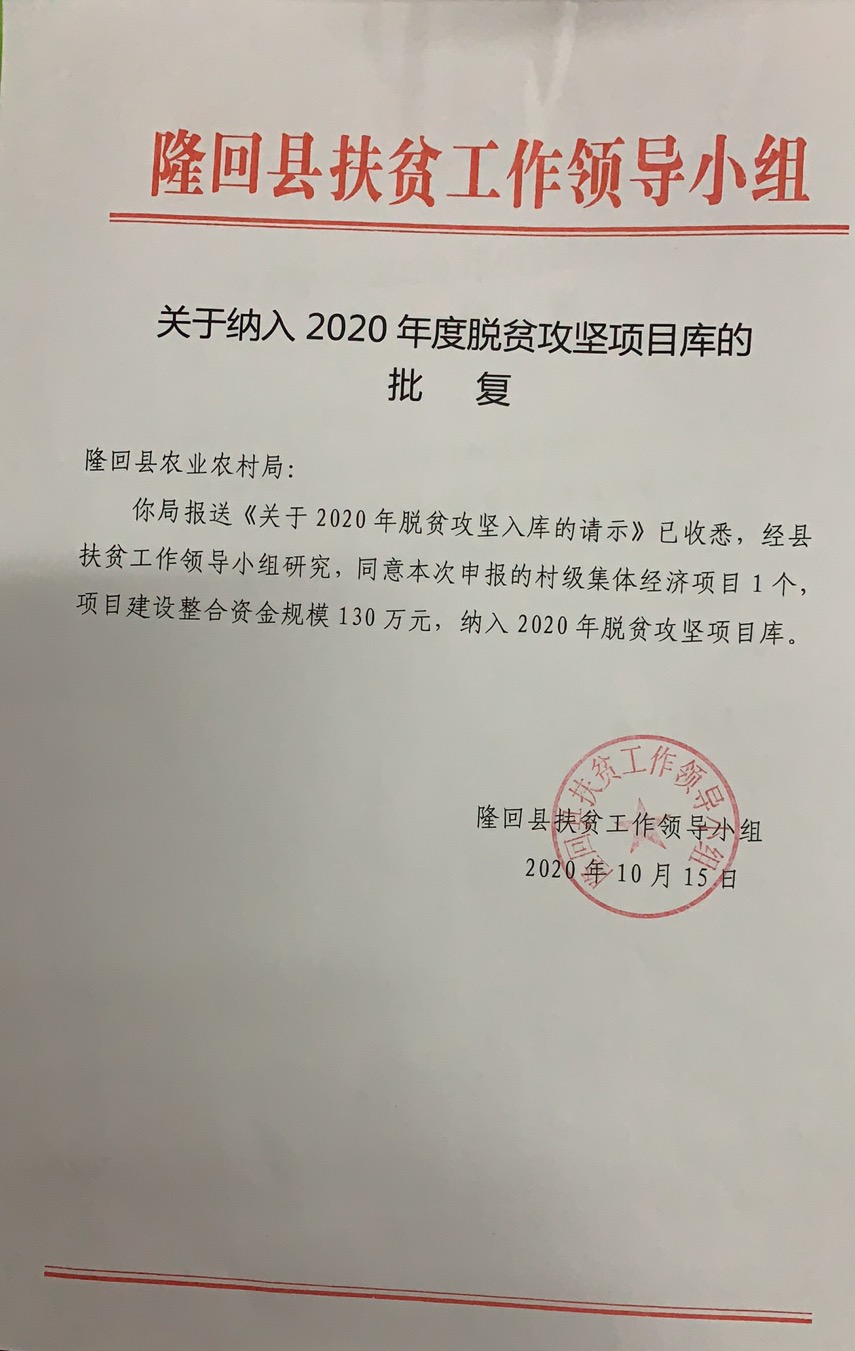 关于纳入2020年度脱贫攻坚项目库的批复(村级集体经济项目)