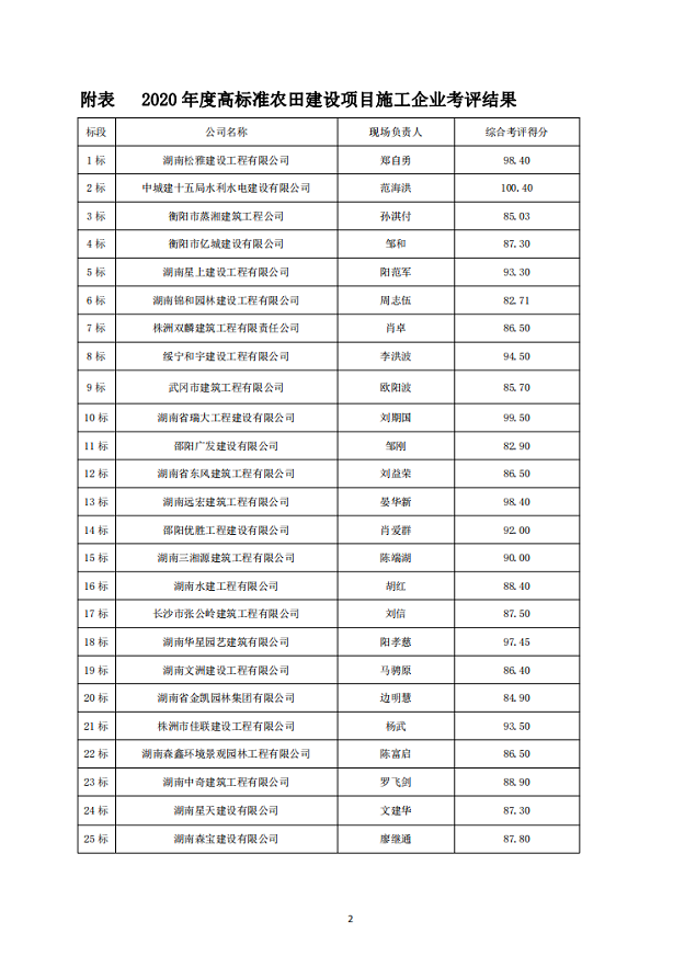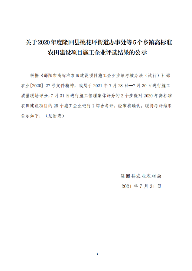 关于2020年度隆回县桃花坪街道办事处等5个乡镇高标准农田建设项目施工企业评选结果的公示