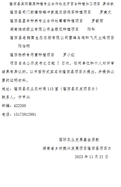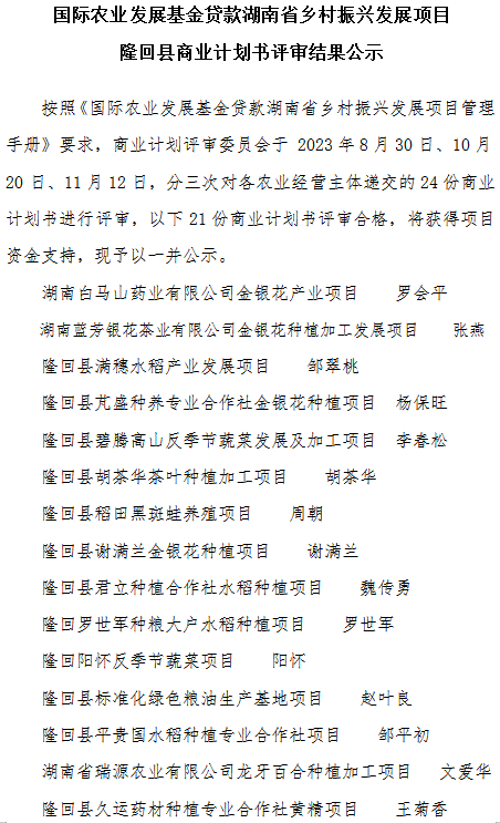 国际农业发展基金贷款湖南省乡村振兴发展项目隆回县商业计划书评审结果公示