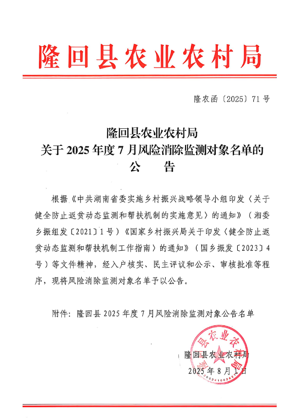 隆回县农业农村局关于2025年度7月风险消除监测对象名单的公告