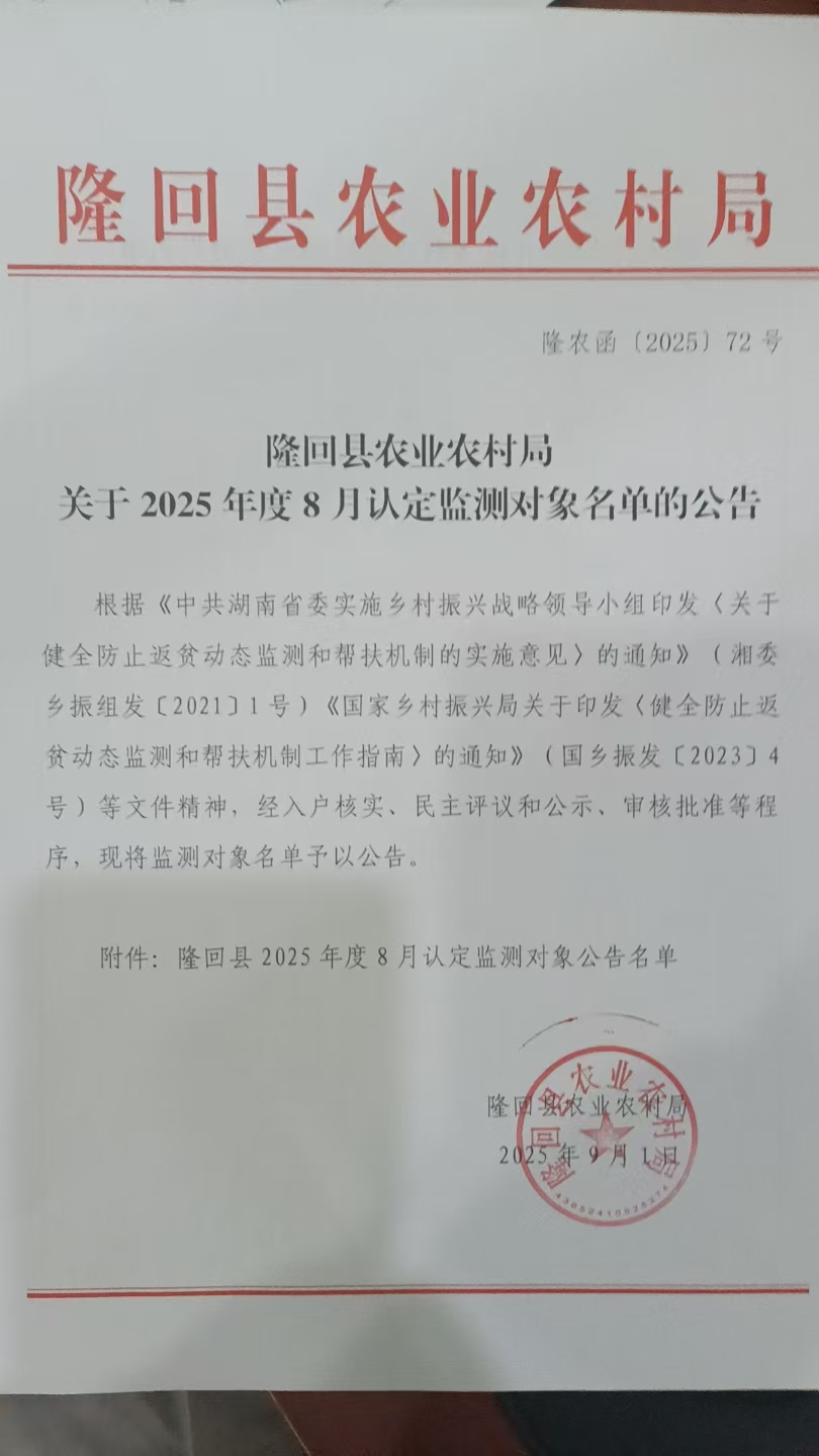 隆回县农业农村局关于2025年度8月认定监测对象名单的公告